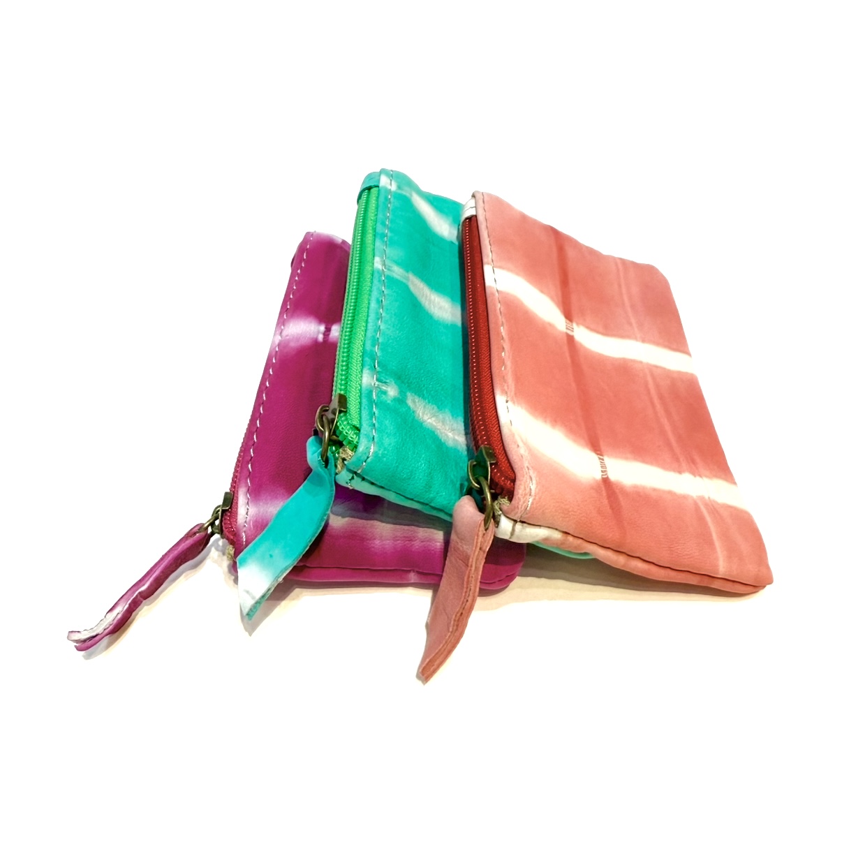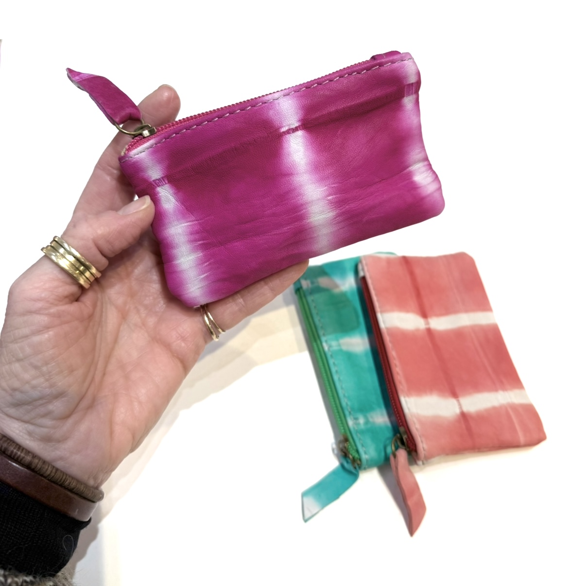Supple tie dye leather coin wallets in bright fuchsia, brick or aqua - please specify color. Leather pull tab, natural cotton interior, 3 x 5"