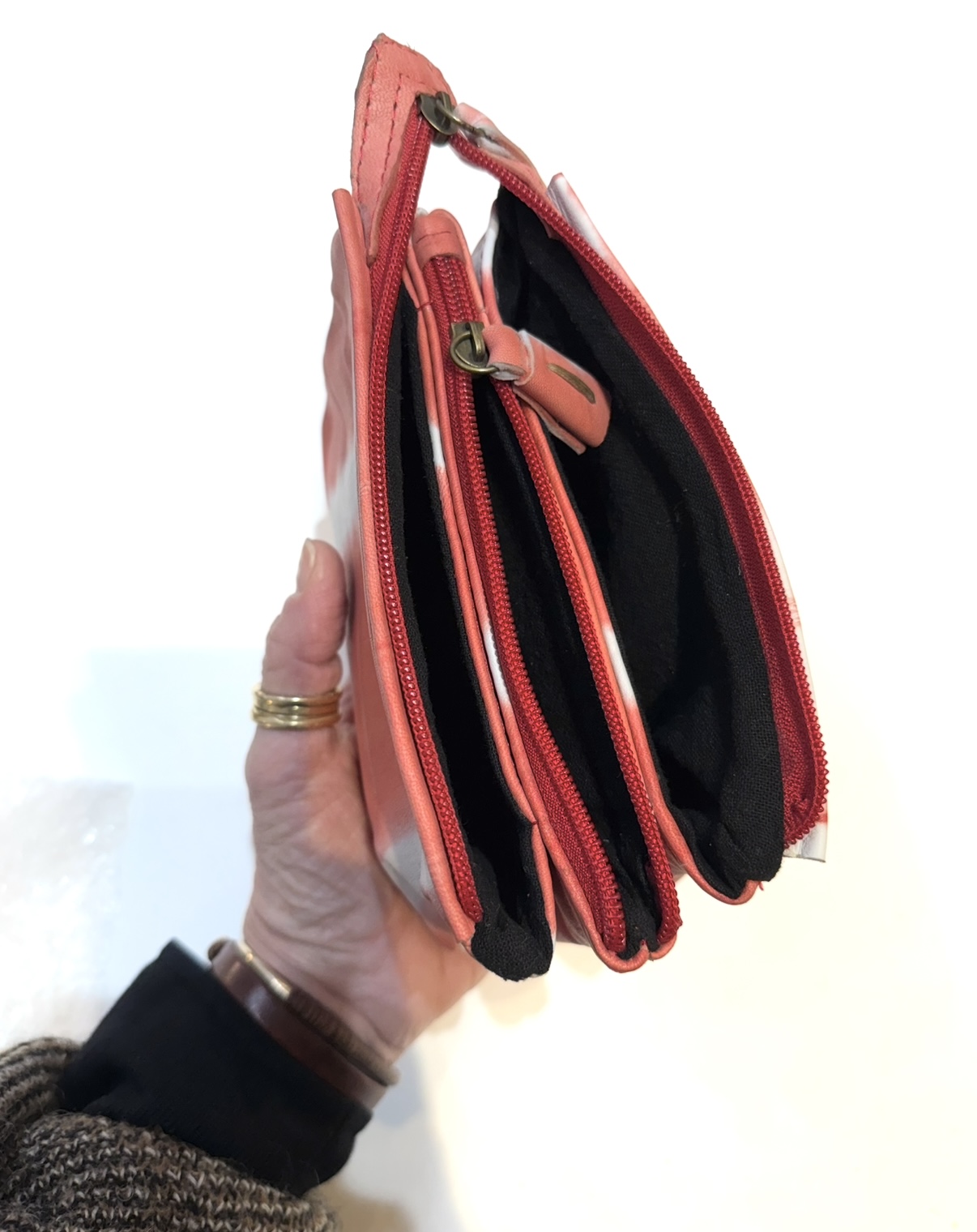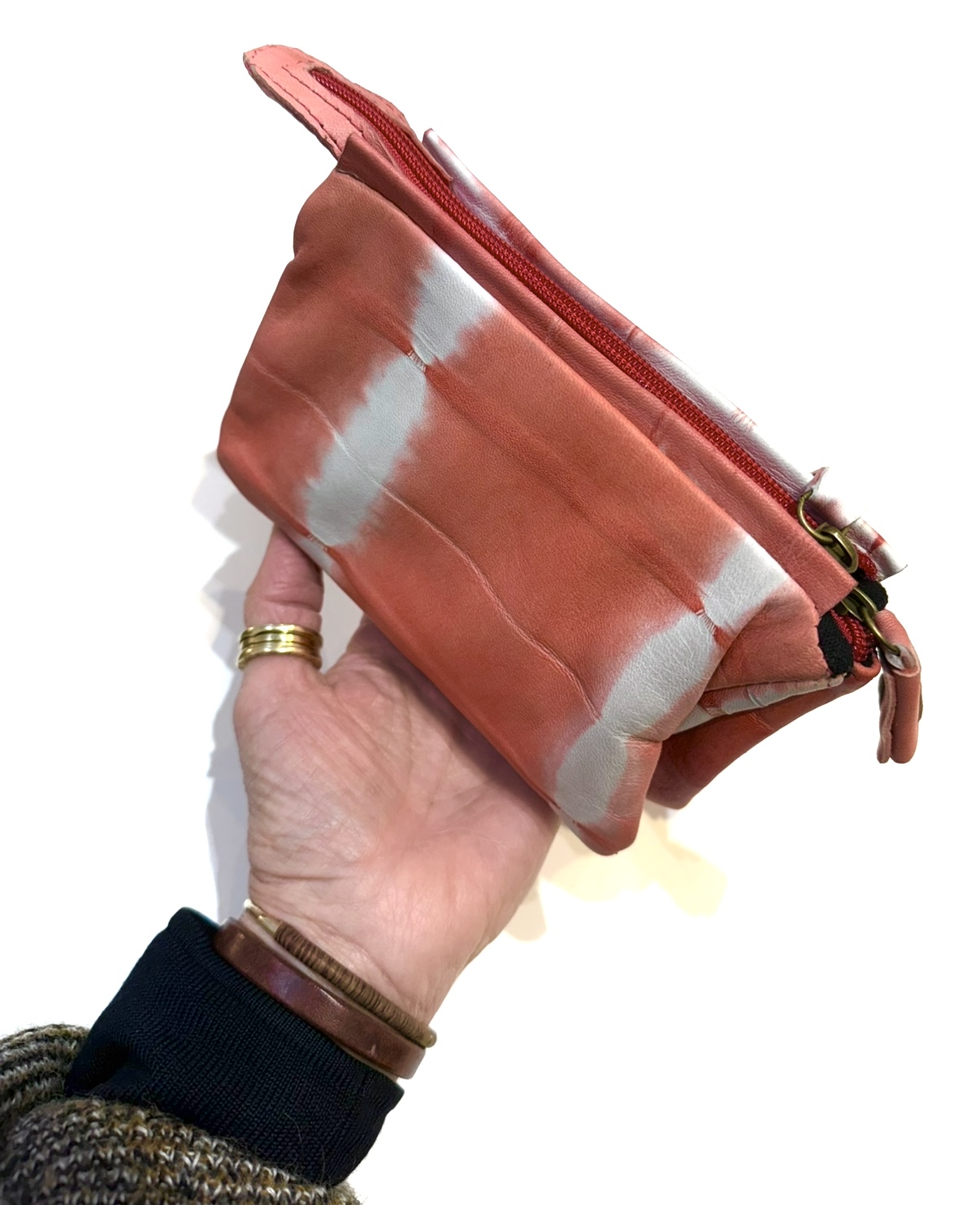 Supple tie dye leather 3-compartment wallet in bright brick orange. Main body zip closure with and added inner zip middle section. Leather zip tab+bead pull, black cotton interior. Each compartment measures 4 x 6.5".