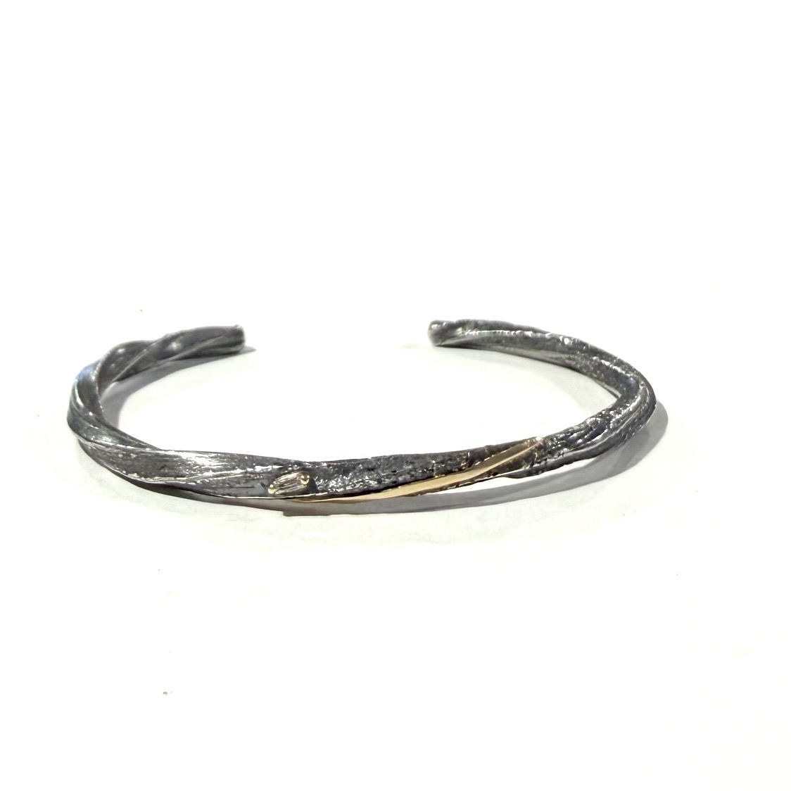 Textured, oxidized sterling silver cuff with detail, 10k yellow gold, bezel-set baguette diamond. 10k god twist detail, too. One of a kind ... and plays well with friends!