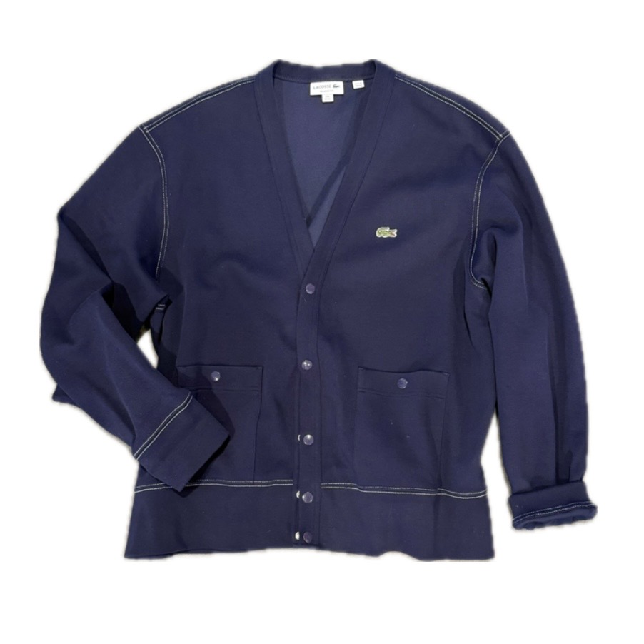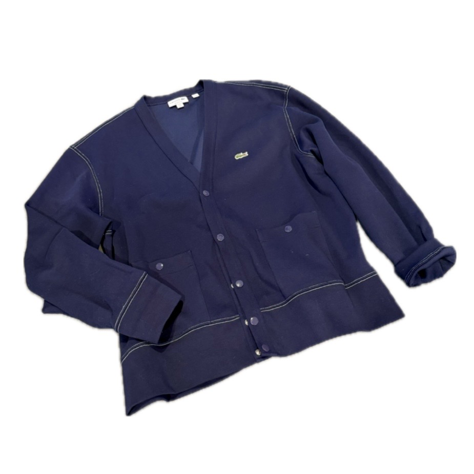 Midnight blue Lacoste jacket with snap front, snap patch pockets and v-neckline. Classic crocodile logo detail. 52% cotton / 42% poly / 6% elastine. This pre-loved item is a final sale.