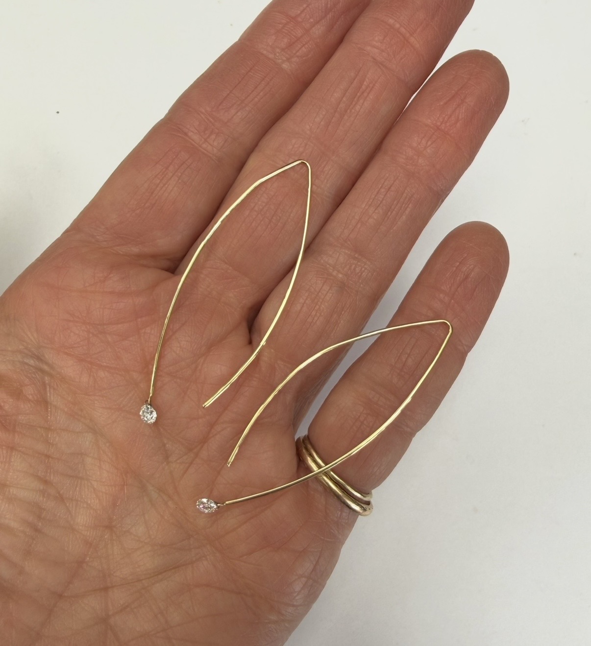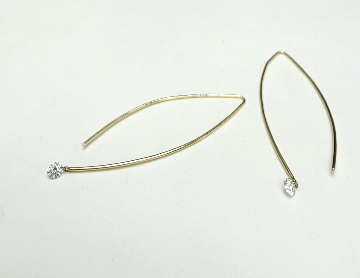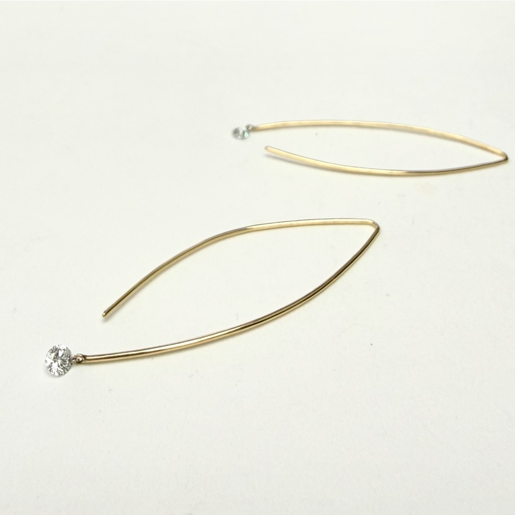 Sleek 18k yellow gold arc hoop earring with faceted, white diamond briolette drops, .38ct. 2 1/8" drop length.