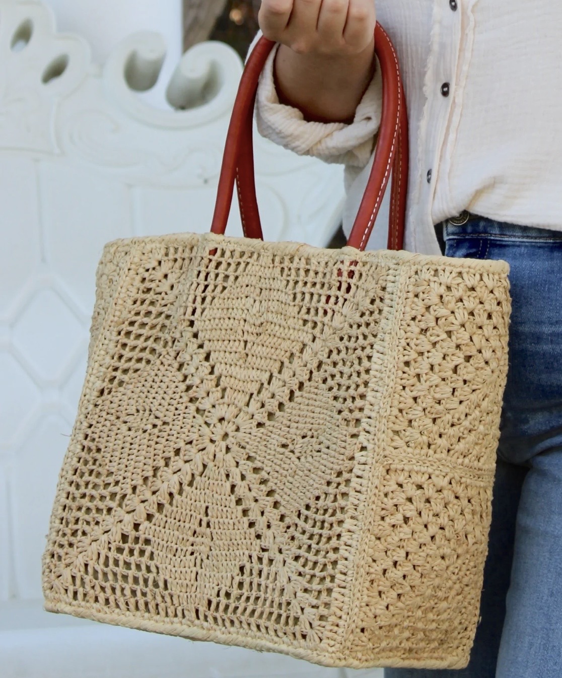 A Summer-ready, handcrafted tote bag with raffia lace square design. Interior pocket, secure drawstring closure and brown leather handles. Dimensions: 12 x7 x 11.5"