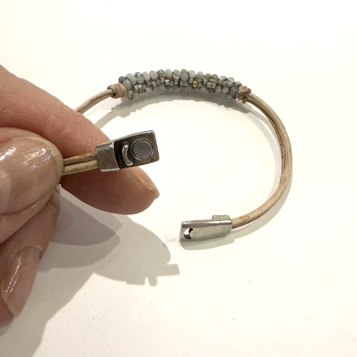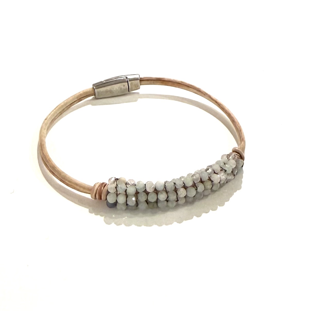 Handstitched faceted morganite beads on 3-strand, natural colored, vintage leather. Easy magnetic clasp. This will go great with any stack combo!