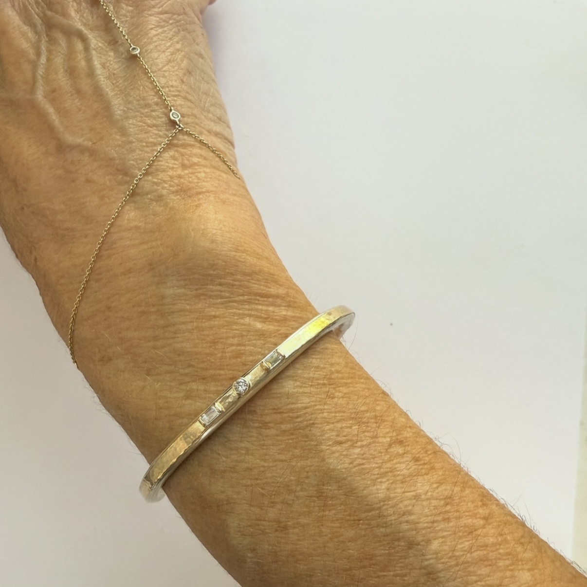 Silky 14k yellow gold cuff, sterling silver core- adorned with 2 baguette and 1 round diamond. Handcrafted with love, one of a kind.
