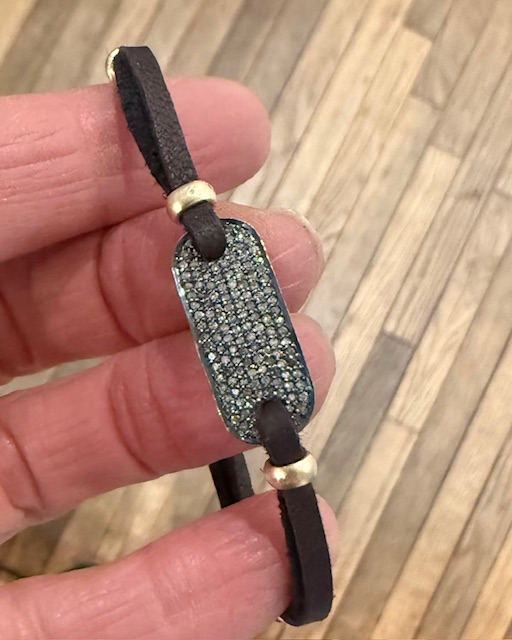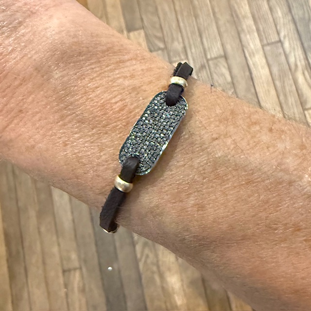 Sterling silver ID covered in pave set diamonds. Dark brown leather wrist wrap with gold plated bead detail and easy magnetic clasp. 6.75"