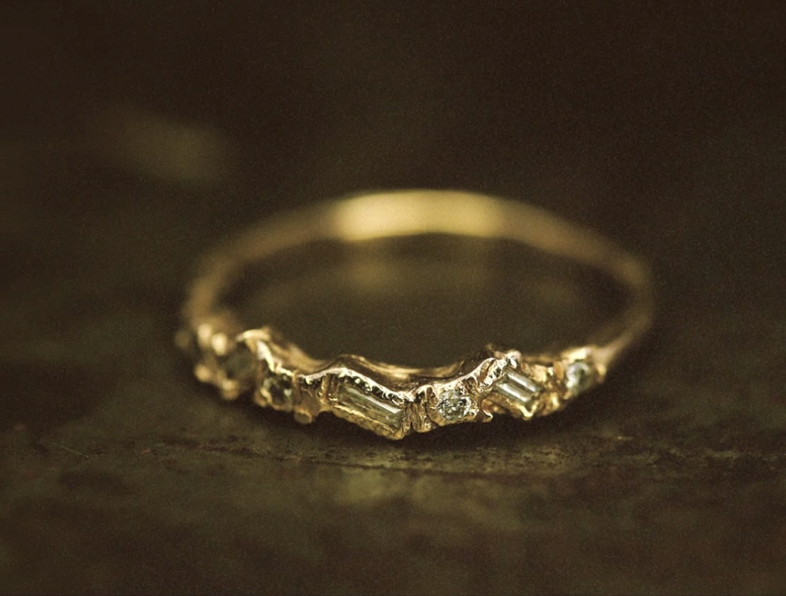 This 1.8mm soft white diamond half eternity Scatter ring is inspired by the medieval jewelry hoards which have been found across Scotland. 14k yellow gold and mixed-shape diamonds, 0.3ct total. A heart and soul of the brand, this ring is perfect for wearing solo, or for stacking. Whether worn as a wedding band, engagement ring, eternity ring or everyday statement ring, this is an easily-adored addition to your collection. Hand made in Scotland. (Shown with our diamond Scatter ring in image #3)