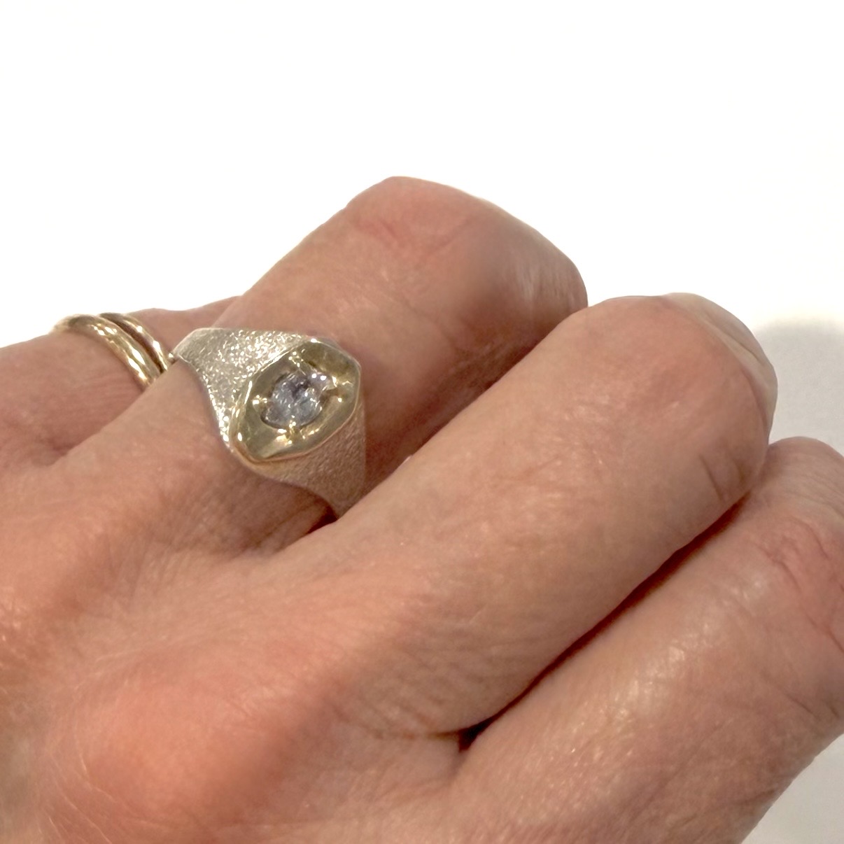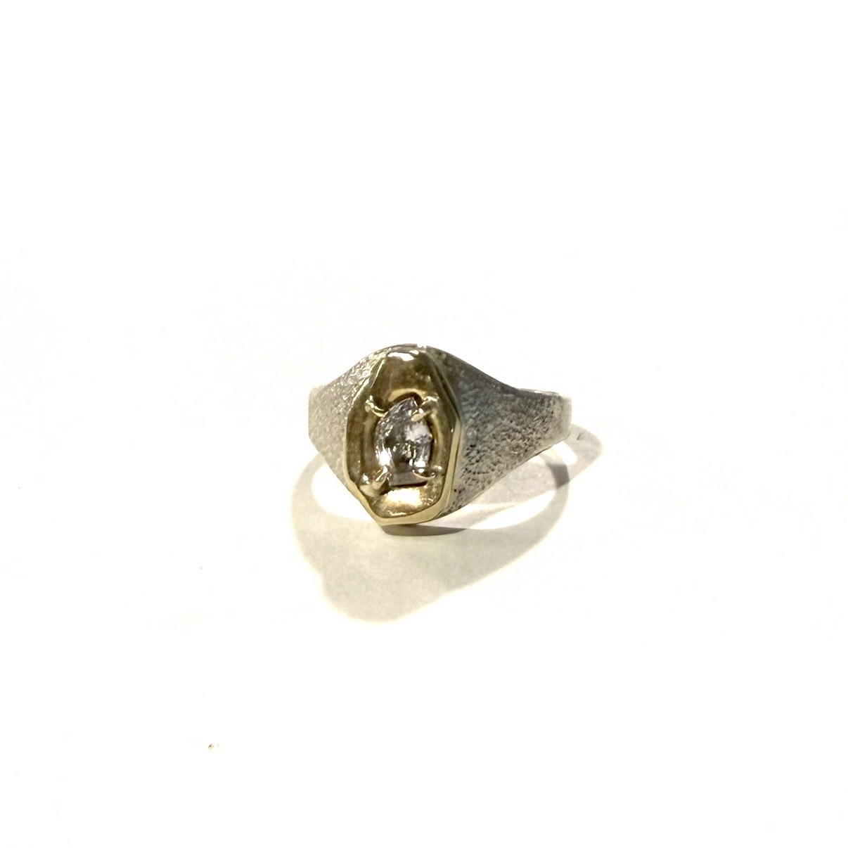 A dreamy faceted white sapphire ..prong-set in a 10k yellow gold pillow.. presented on a prbblr-textured sterling silver band. One of a kind.