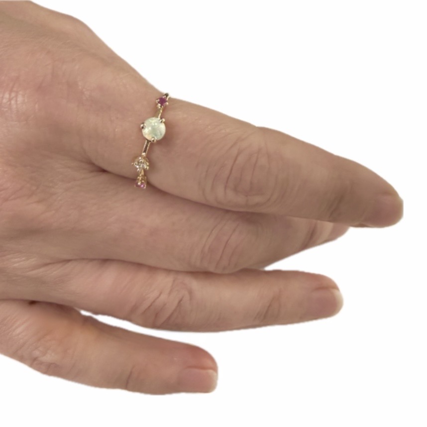 An 14k yellow gold celestial beauty with feature, prong set Australian opal, 2 pink sapphires, and a single white diamond. One of a kind.