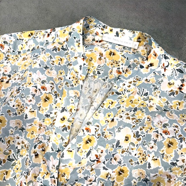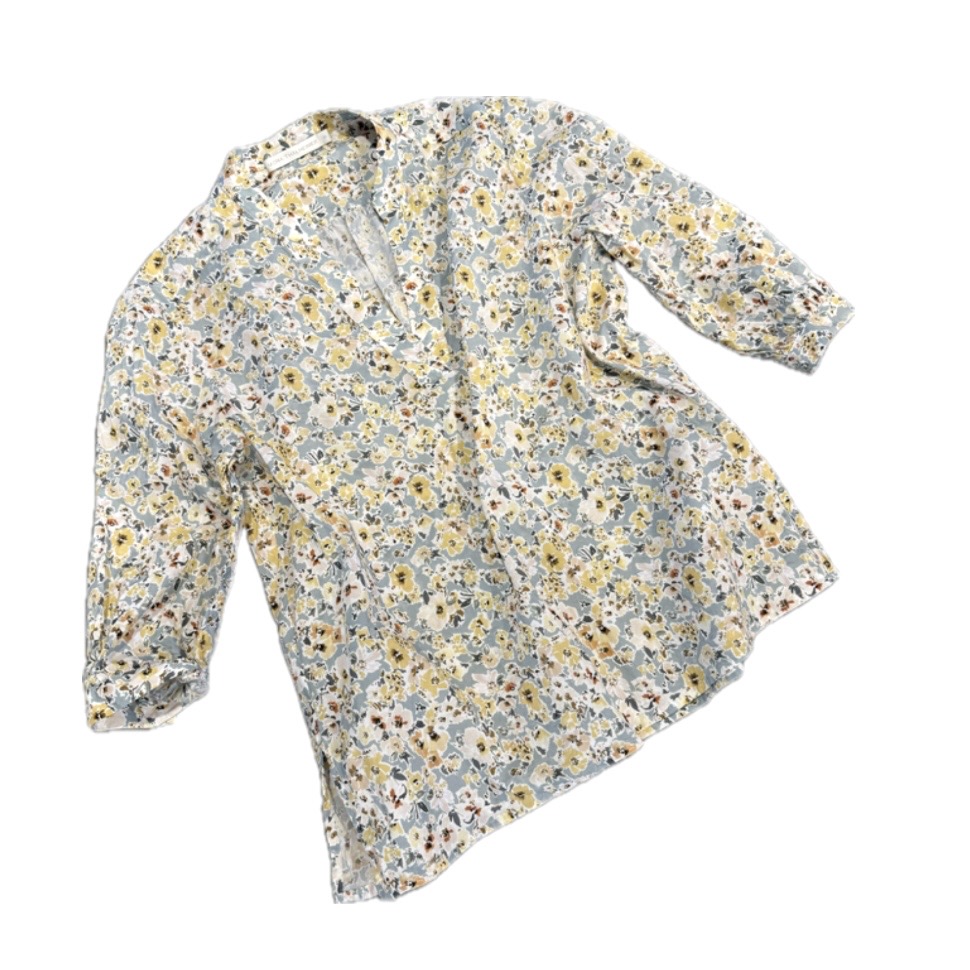 Mona Thalheimer cotton floral crop tunic. V-placket neckline, 3/4 sleeve. This pre-loved item is a final sale.