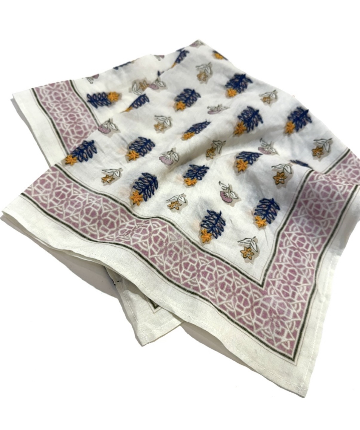 100% cotton bandana in a neutral light shade with saffron and midnight blue embroidery detail. Finished edges, 20 x 20".