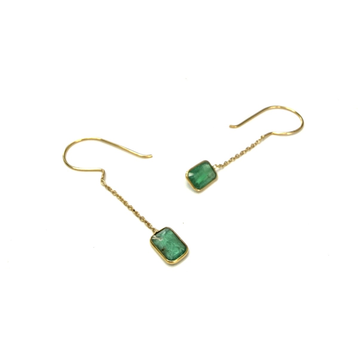 Emerald-cut emerald earrings - .32ctw. -handsomely bezel set in 18k yellow gold. 1 5/8" drop length.