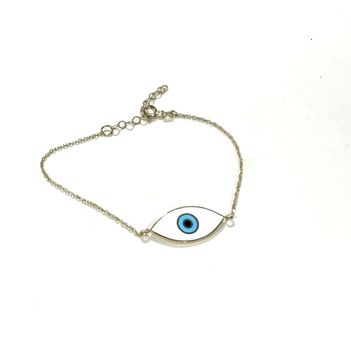 14k yellow gold bracelet with white, blue and black enamel evil eye feature. THE COOLEST! 6" in length plus 1.25 chain extension.