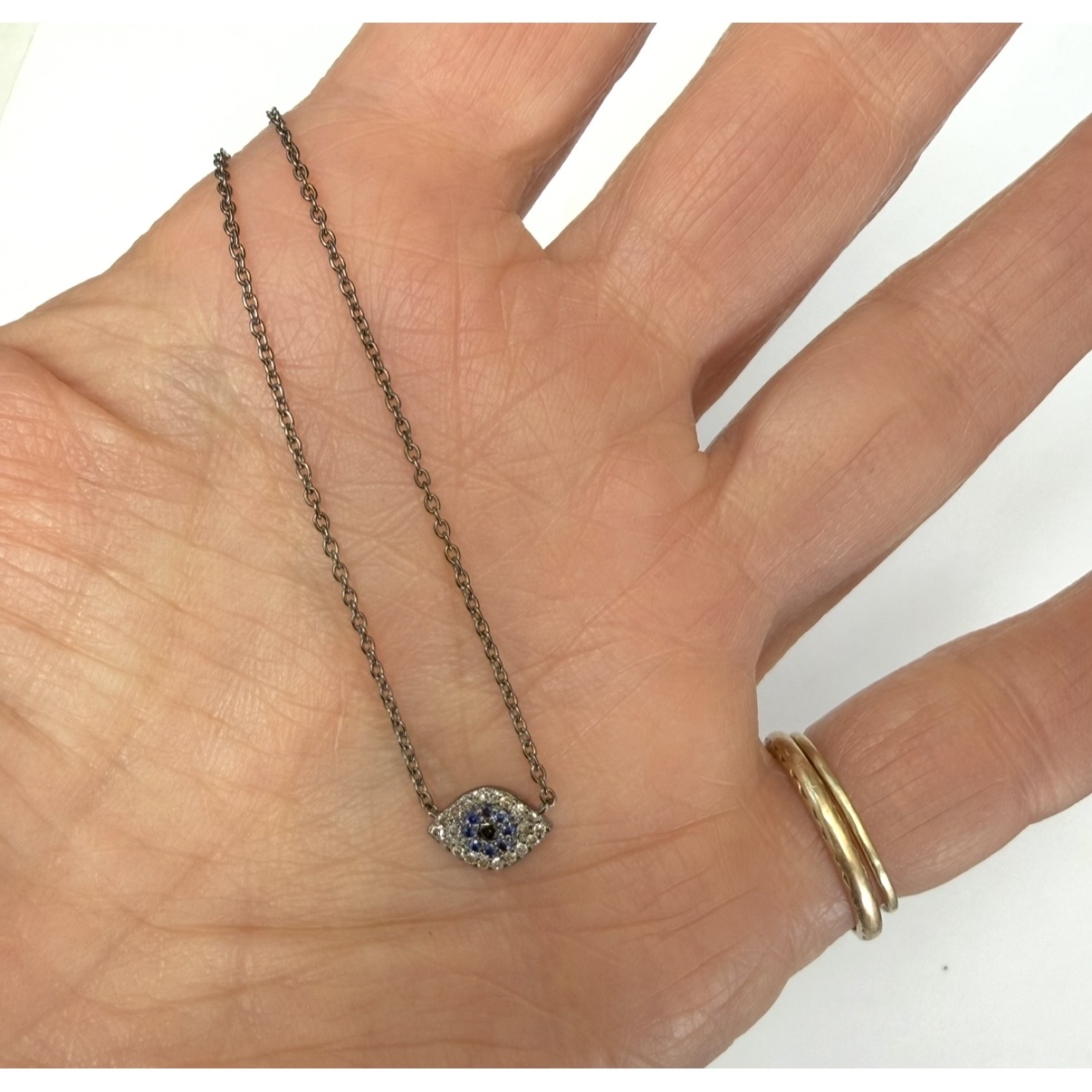 Oxidized sterling silver necklace with a pave diamond eye pendant, sapphire iris. Length stations at 15, 16, 17 and 18".