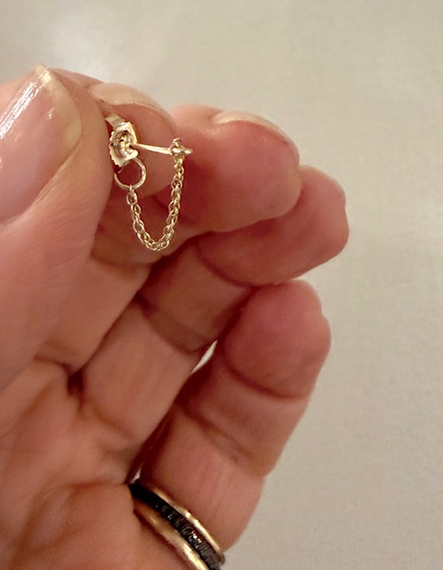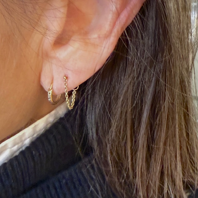 14k yellow gold chain hoop earring - the chain connects from the post to the backing. Sleek perfection. These are sold singly - currently, only 1 is available. Please inquire if more are required!