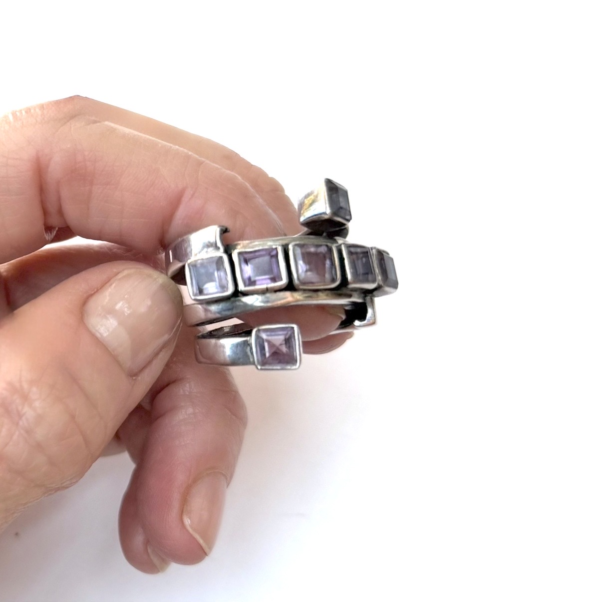 Sculptural sterling silver ring with 7 bezel-set, faceted amethyst stones. This pre-loved item is a final sale.