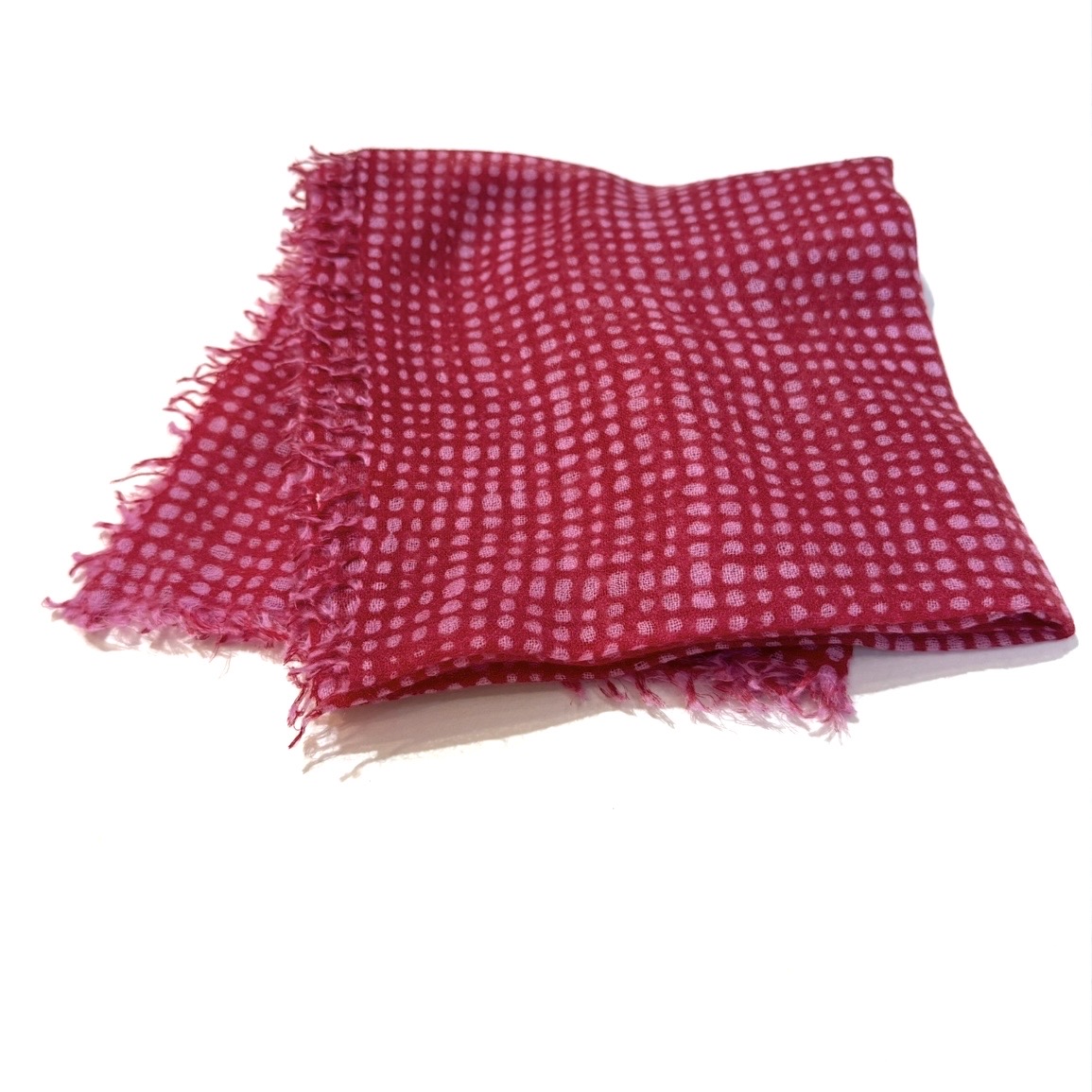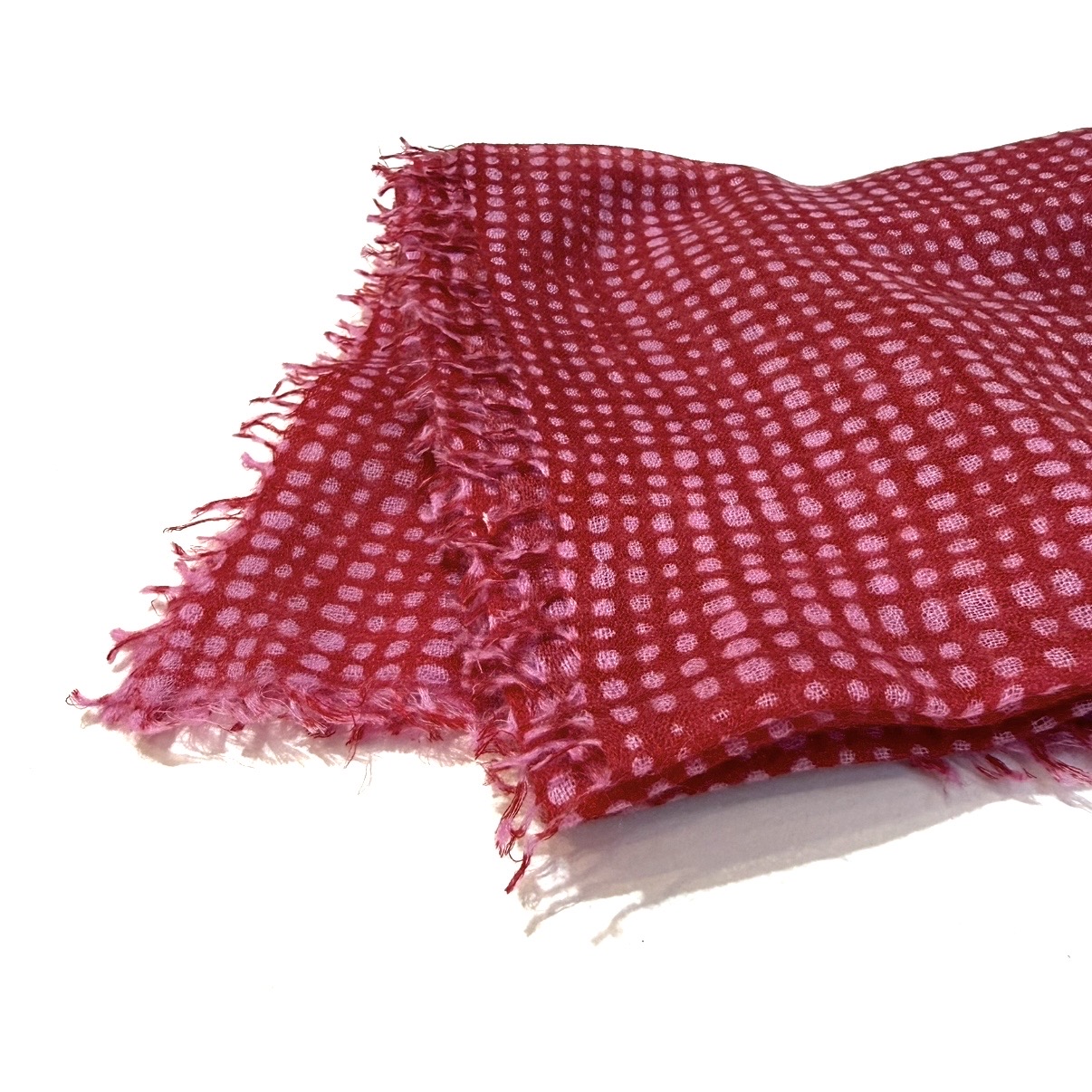 100% fine, tissue weight cashmere bandana in vibrant red and pink. Dry clean only, made in Nepal. 28 x 30".