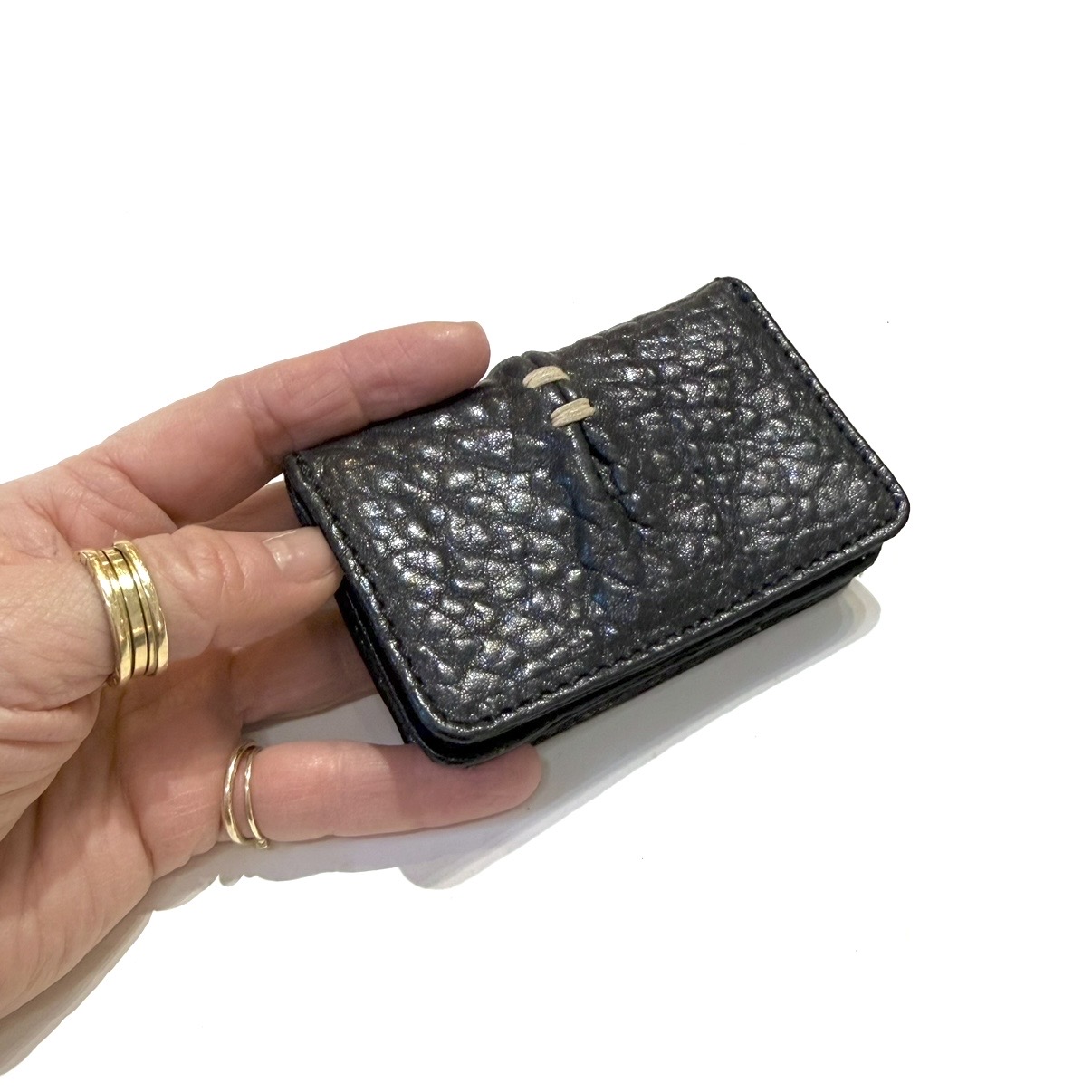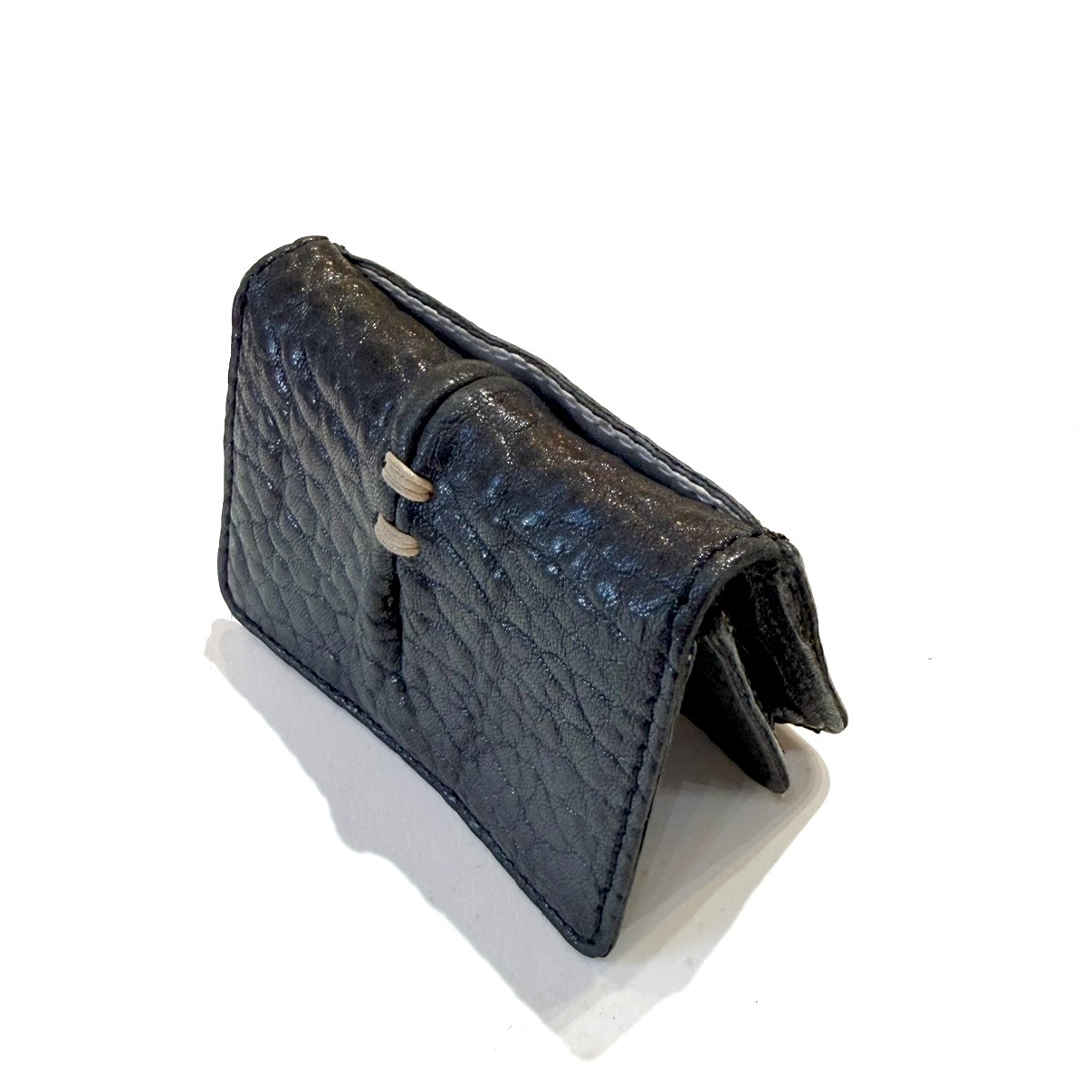 Black, textured leather credit card case by 49 Square Miles. Duo inner pocket, snap closure, tan stitch detail. 4.25 x 2.75 x .75". This pre-loved item is a final sale.
