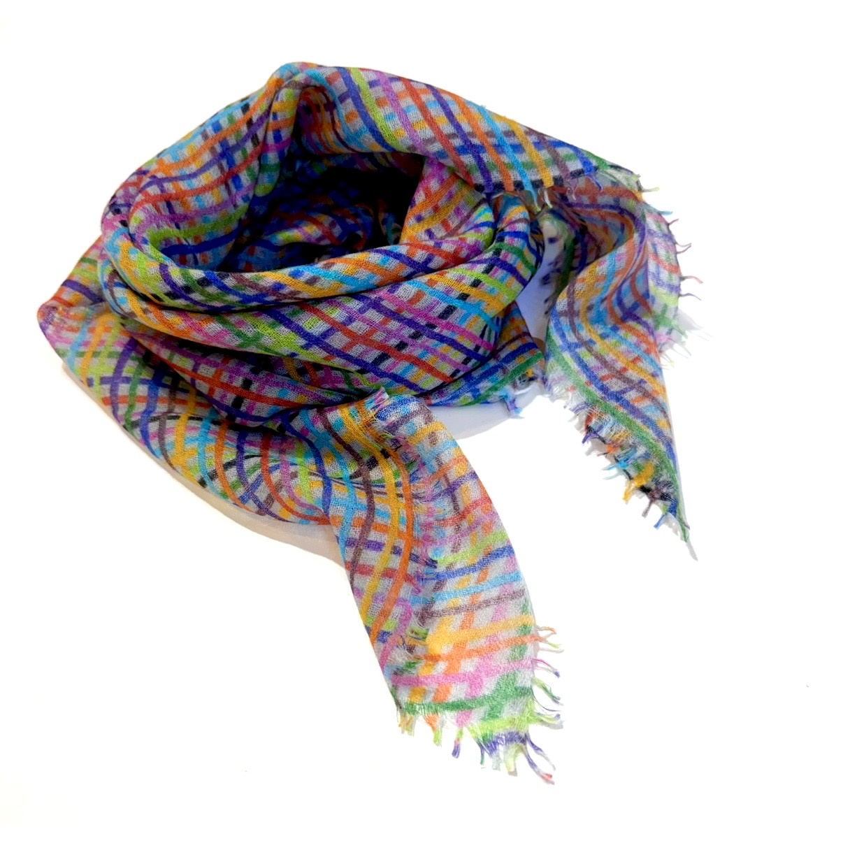 100% fine, tissue weight multi-colored cashmere bandana. Dry clean only, made in Nepal. 28 x 30".