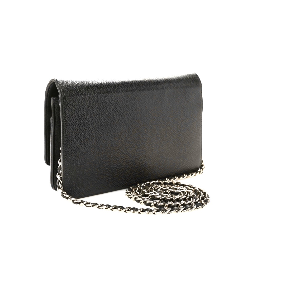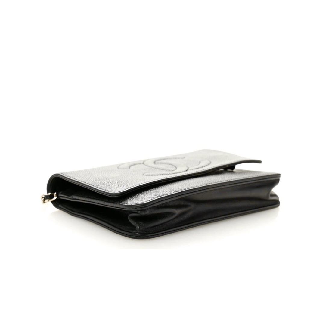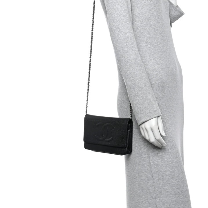 Authentic Chanel Caviar Timeless CC Wallet in black. Crafted of luxuriously textured caviar leather in black, with a Chanel CC logo embossed on the front. The bag features a 24" leather threaded chain-link shoulder strap and a crossover flap. Opens to a black fabric and leather interior with card slots, patch pockets, and a zipper compartment. These are stock images, chain on strap shows wear - please inquire for images of actual item! 5H x 7.5W x .75"D. This pre-loved item is a final sale.