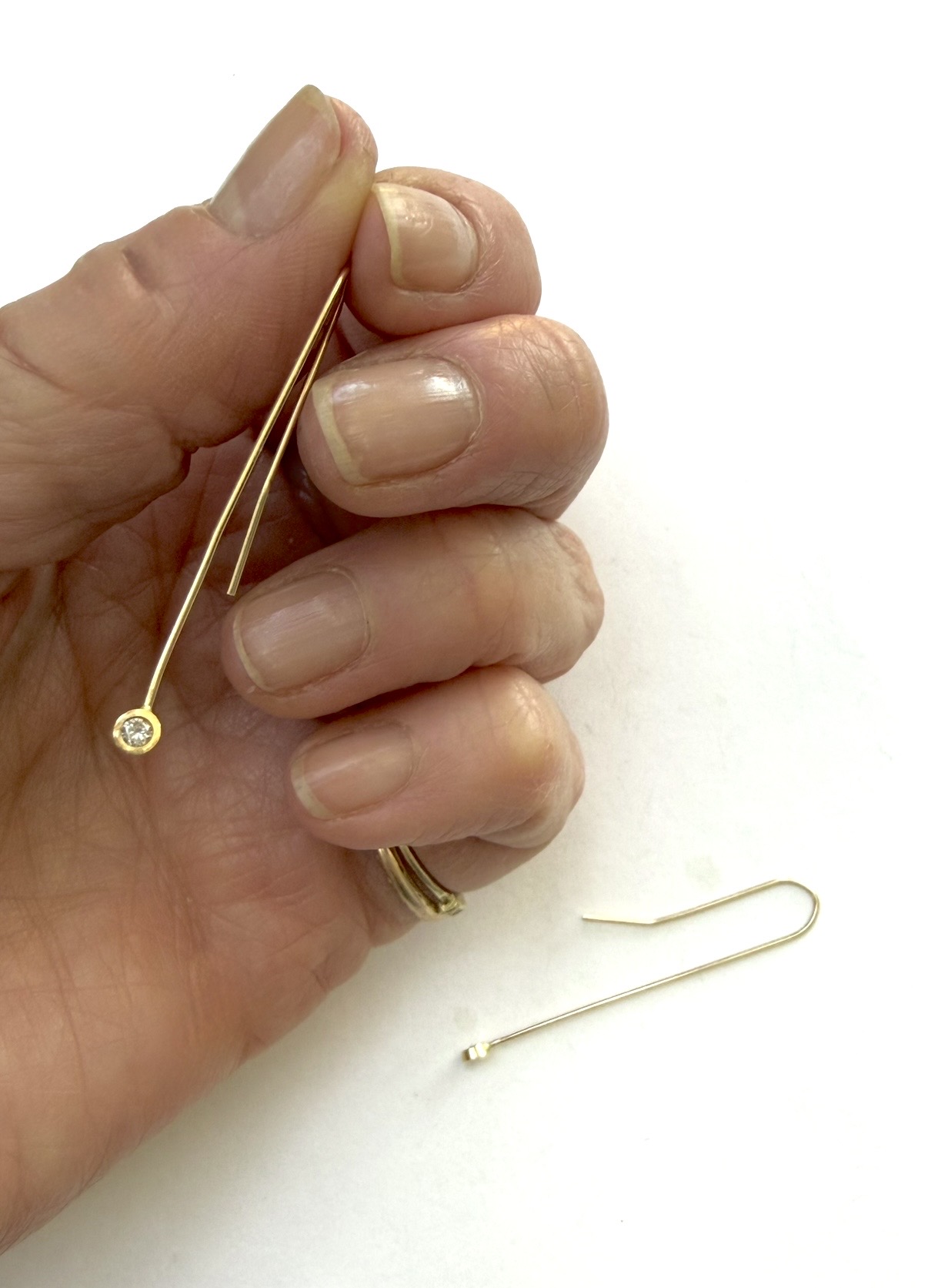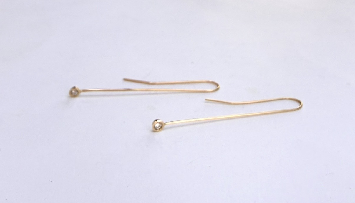 14k yellow gold and bezel set white diamond stick-drop earring, 1.75" long. This pre-loved item is a final sale.