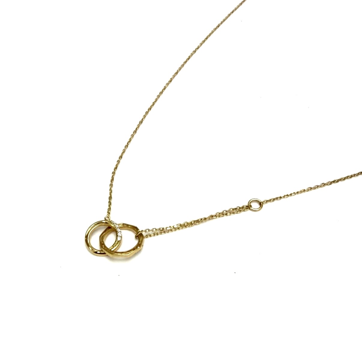 18k gold necklace with 2 interlocking rings, both white diamond adorned. Unique duo chain detail at front portion. Length options at 15.5 and 17".