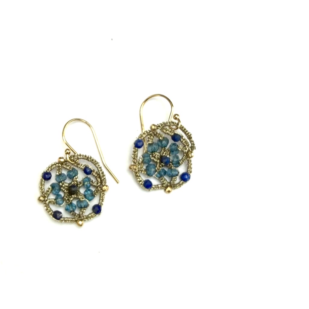 A cluster of lapis, London blue quartz and gold pyrite delicately lacewoven in gold cord. Gold fill earwire, drop length 1".