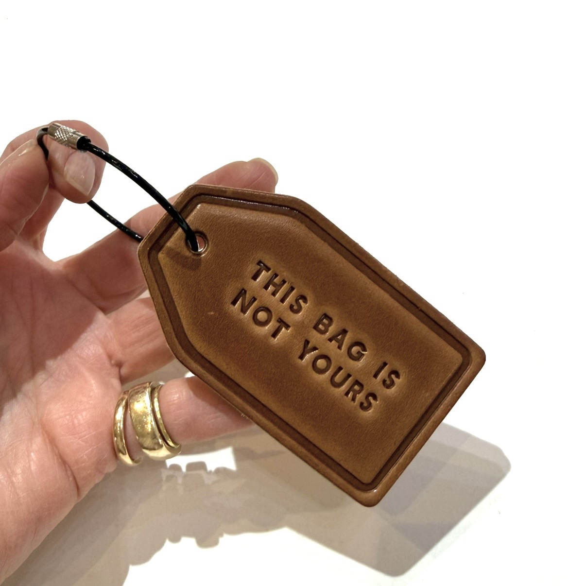 Solid cognac leather luggage tag - a unique and hilarious goft for the traveler in your life! 3.5 x 2". Cut and pressed by hand from some of the thickest and finest harness leather available - this baby will patina beautifully with age.