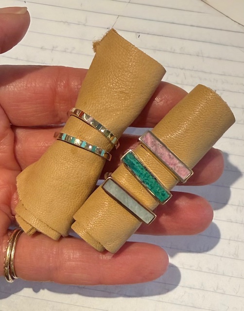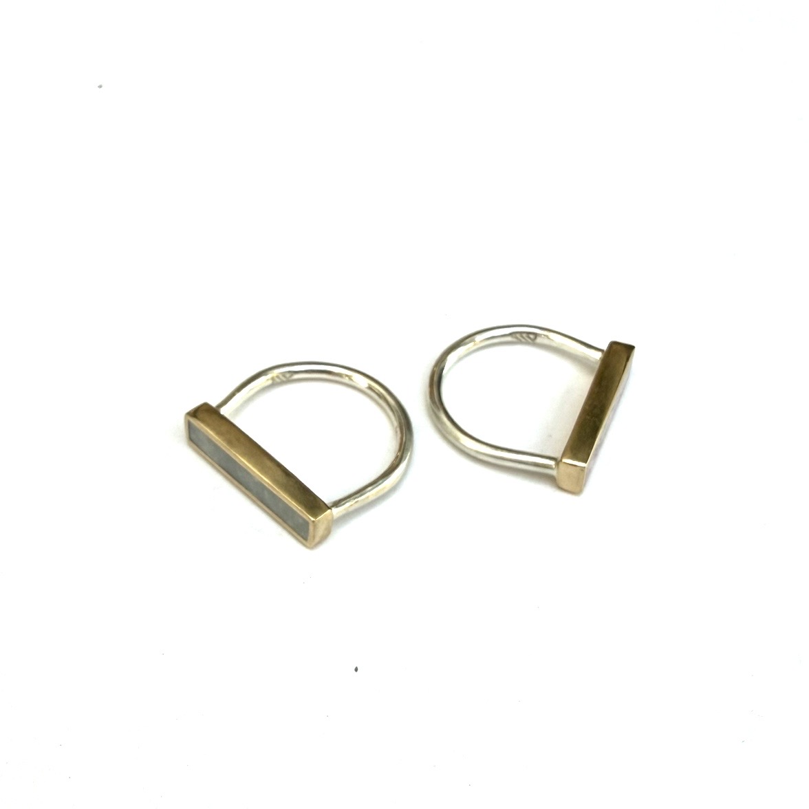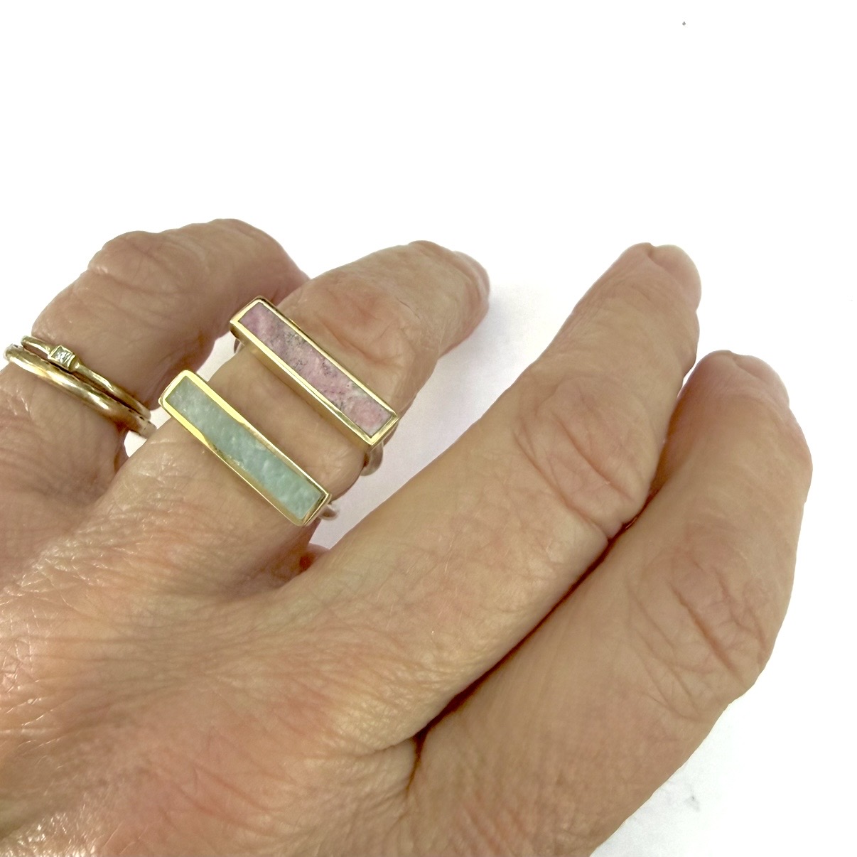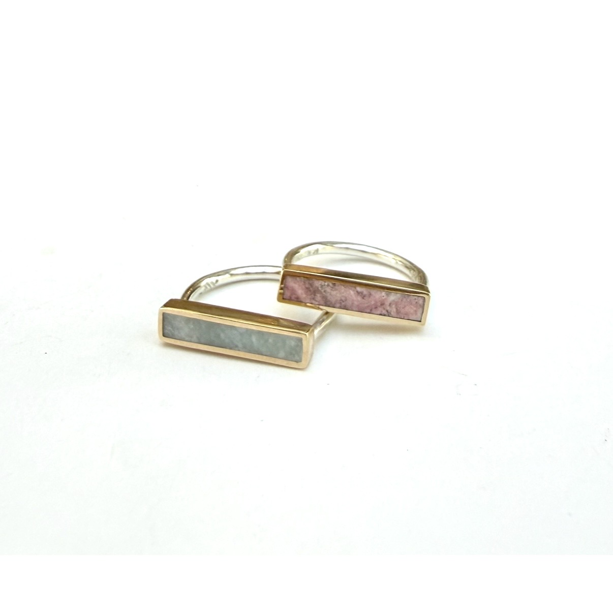 Gorgeous falet top stacking rings in mixed-metal 14k yellow gold, flush bezel stone setting on sterling silver shank. Choose from amazonite (blueish/grey) or rhodonite (pale pink) - please specify. Price reflected is per single ring.