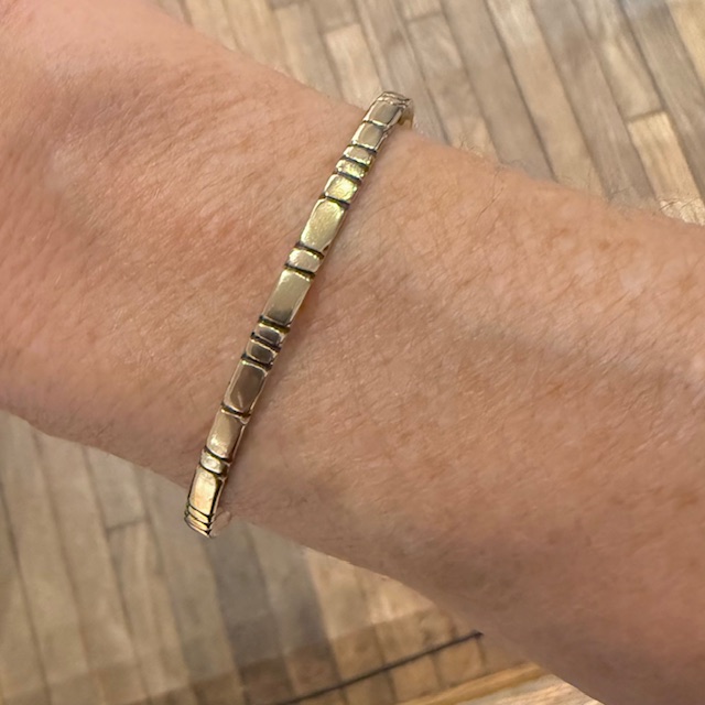 A delicate yet substantial brass cuff with carved line detail. Measures 1/8” wide x 5 1/2” around, 1” gap.