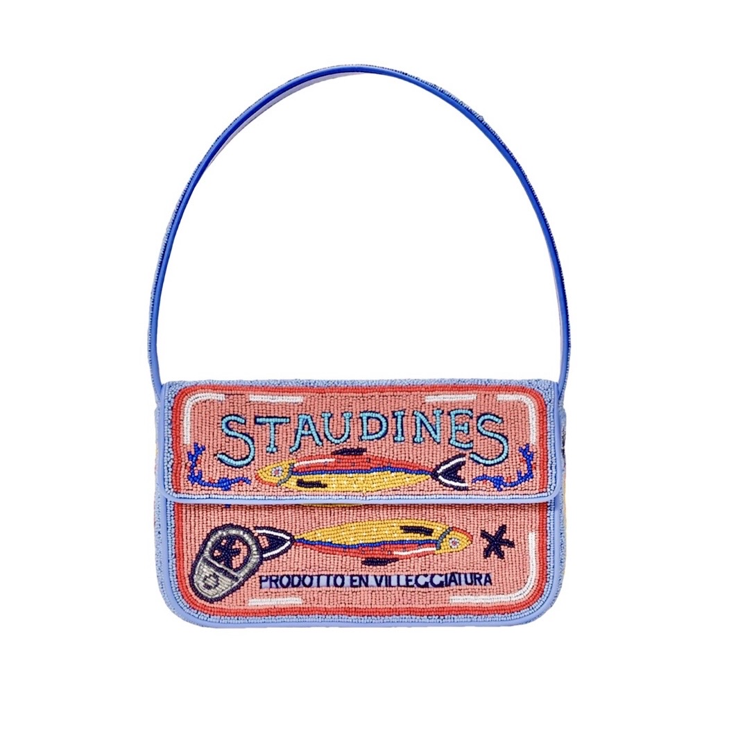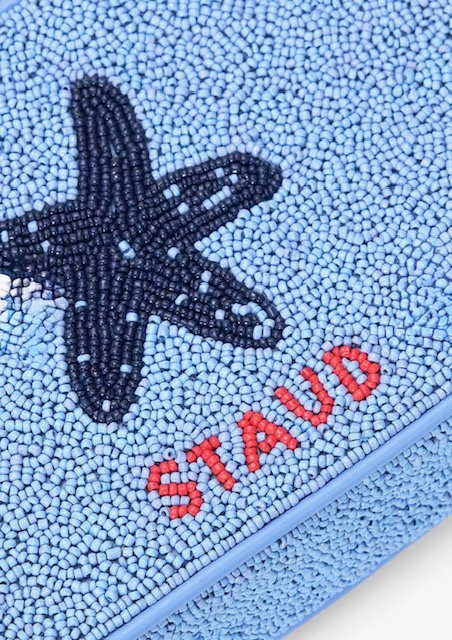 This NEW WITH TAGS Staud fully hand-beaded 'Tommy' bag features a magnetic snap closure and an open back pocket. Inner zip pocket, 6.25 x 10.25 x 2", 8.5" strap drop length. 100% Glass Beads; Base: 100% Rayon; Trim: 100% Vegan Leather Piping. This pre-loved item is a final sale.