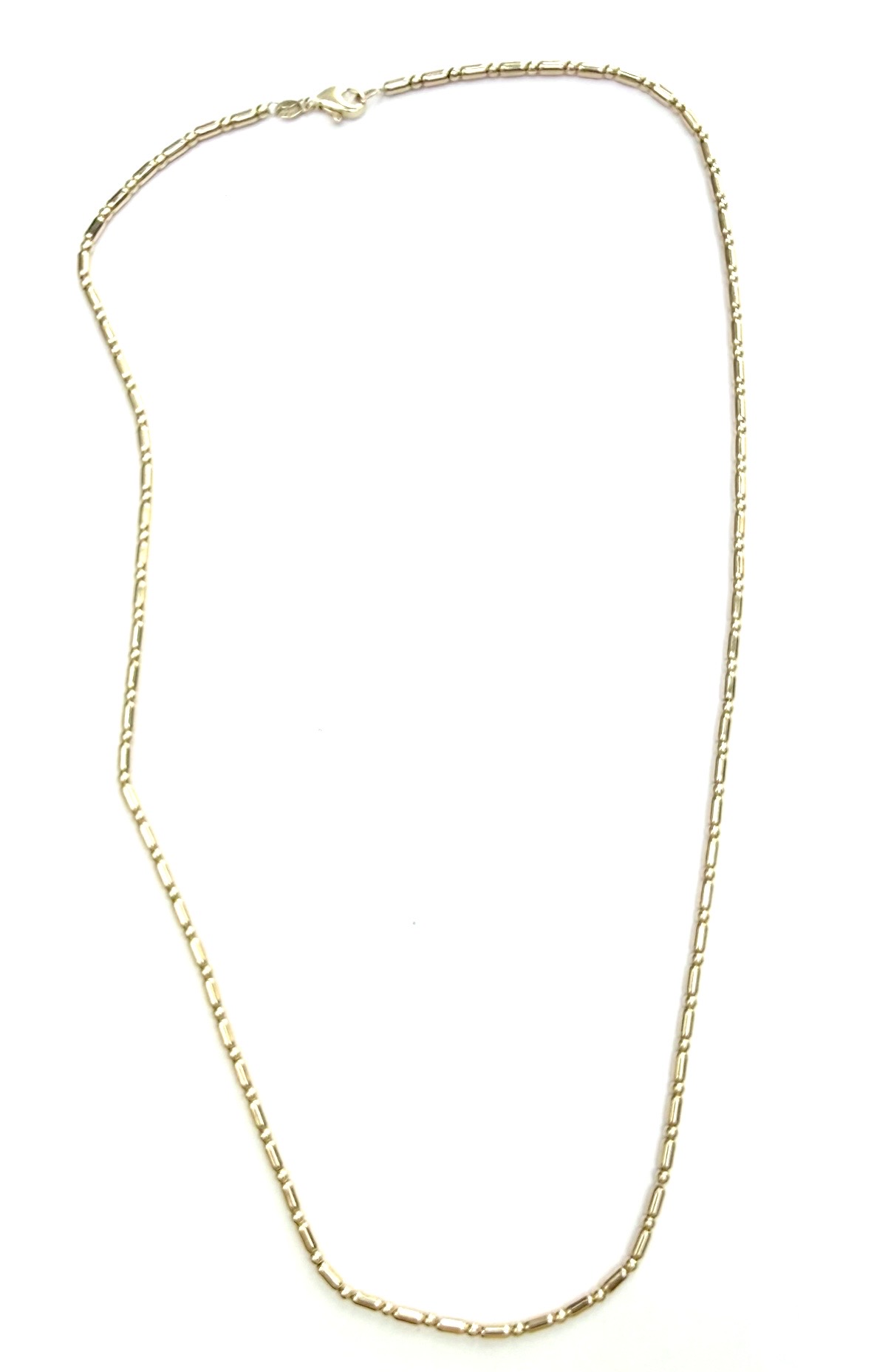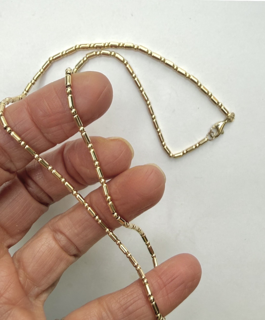 Crazy cool 14k yellow gold neck chain with a unique dot/dash link look. Layers like a champ!