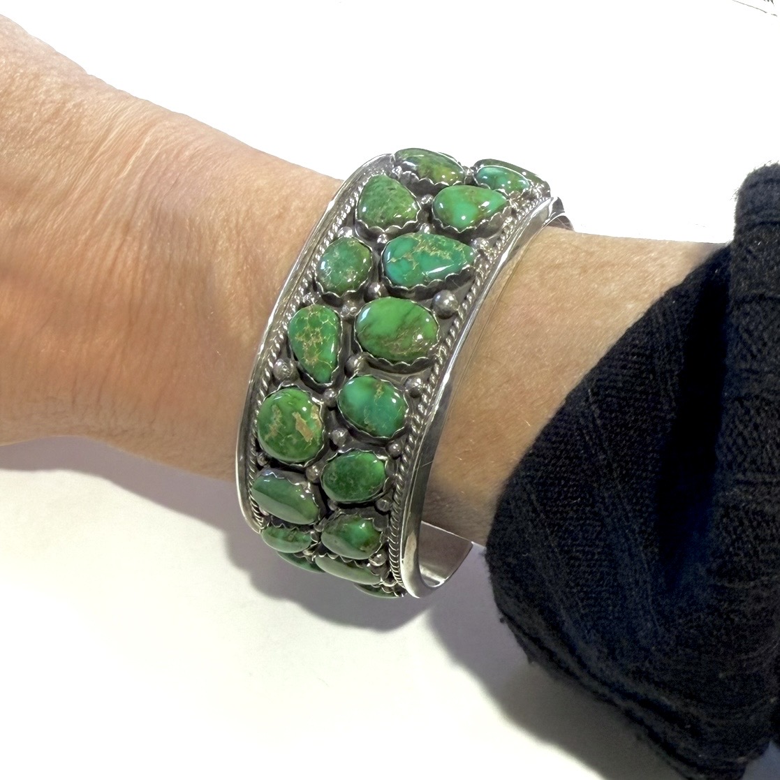Spencer, sterling silver cuff bracelet with 28 scallop-set, green turquoise stones. 1 1/8" wide, fit is 2.5" wide. This pre-loved item is a final sale.