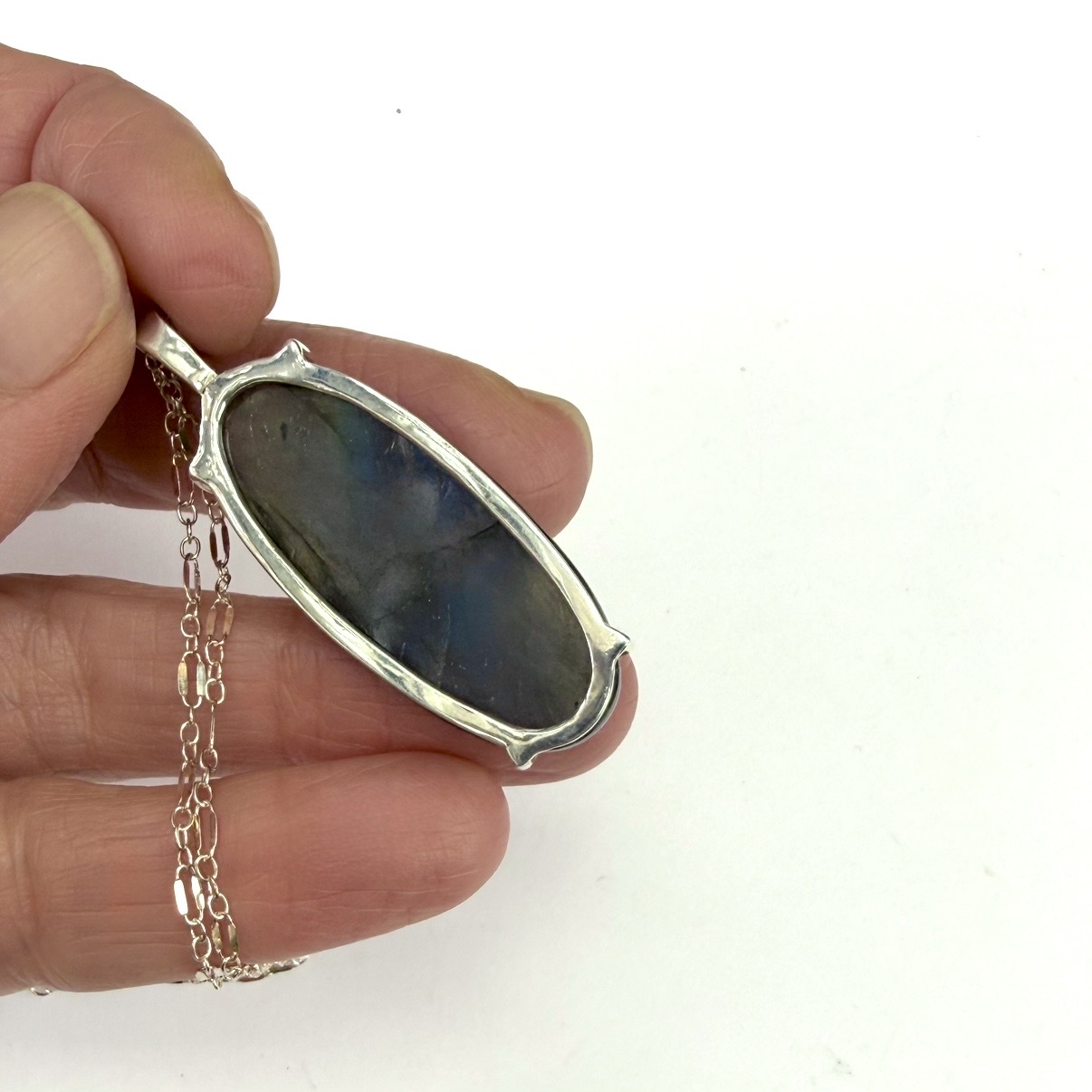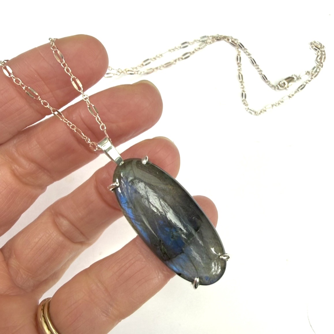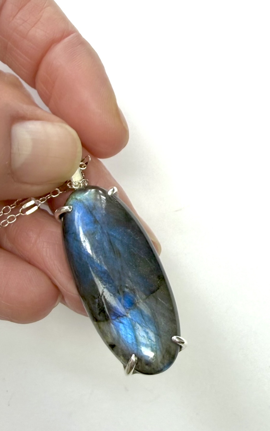 A gorgeous, smooth oval labradorite, prong-set on sterling silver, 2" drop length. Mixed-length link silver chain, one of a kind.