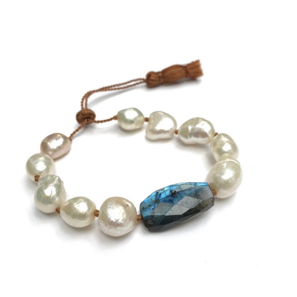 Gorgeous pearl bracelet with feature, faceted labradorite top stone hand-knotted on brown cording. Easy slip knot closure.