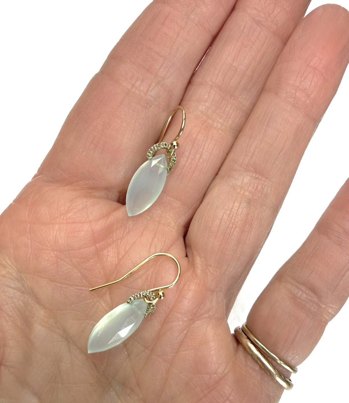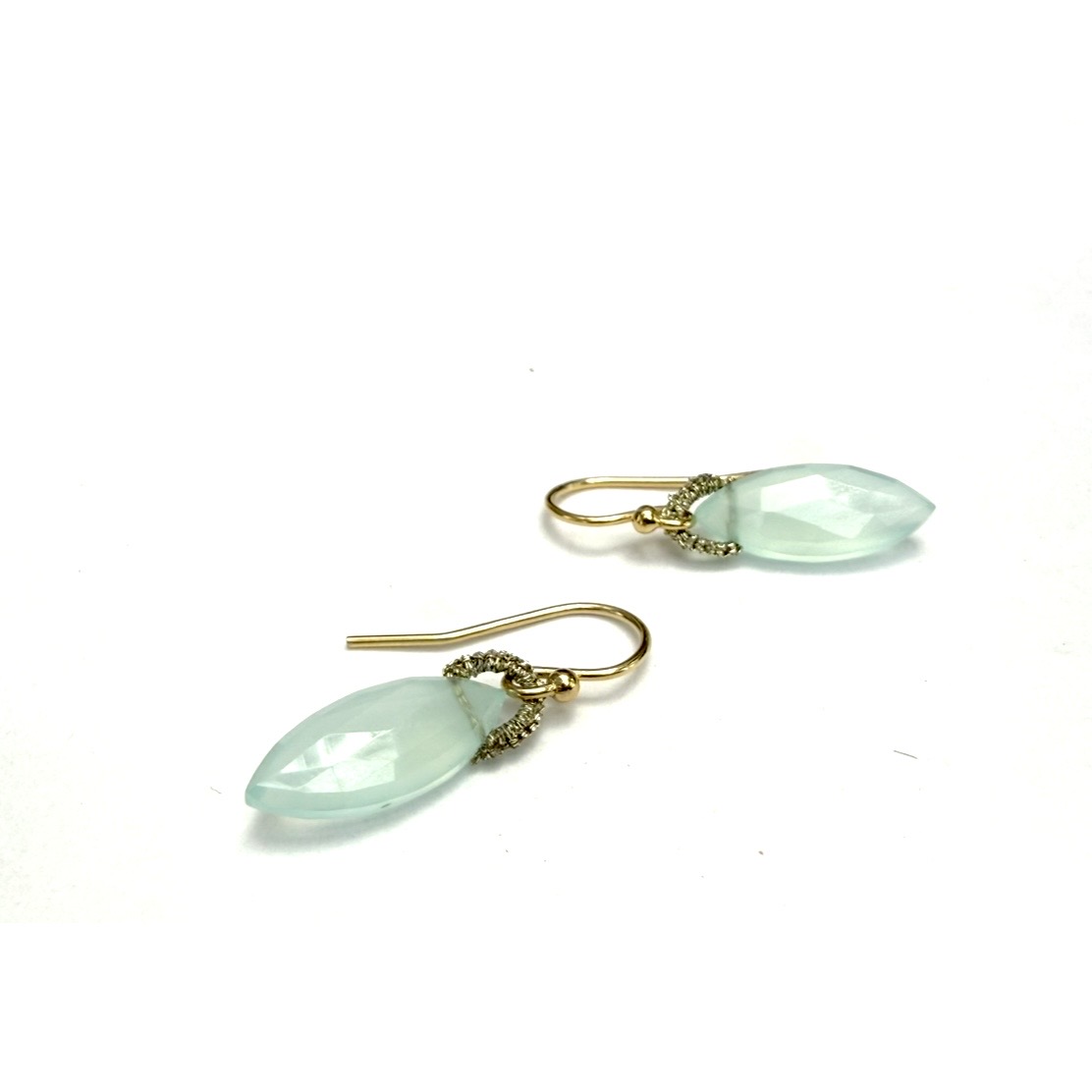 Delicately handmade earring of faceted dreamy, milky blue Peruvian calcite dangling from lace-woven silk. Gold fill earwire. Total drop length 1"
