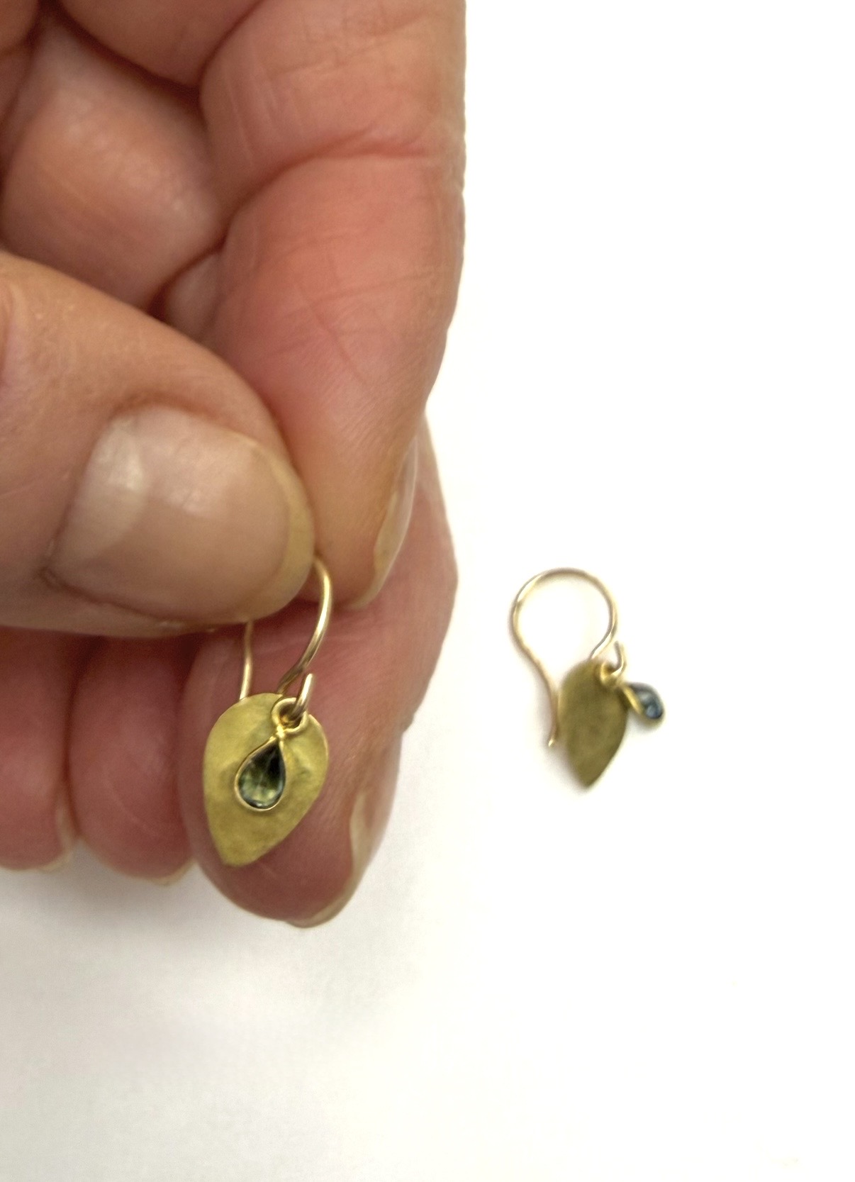 18k yellow gold 'petals' with bezel set sapphire detail. The perfect light-and-easy earring at 3/4" total drop length.