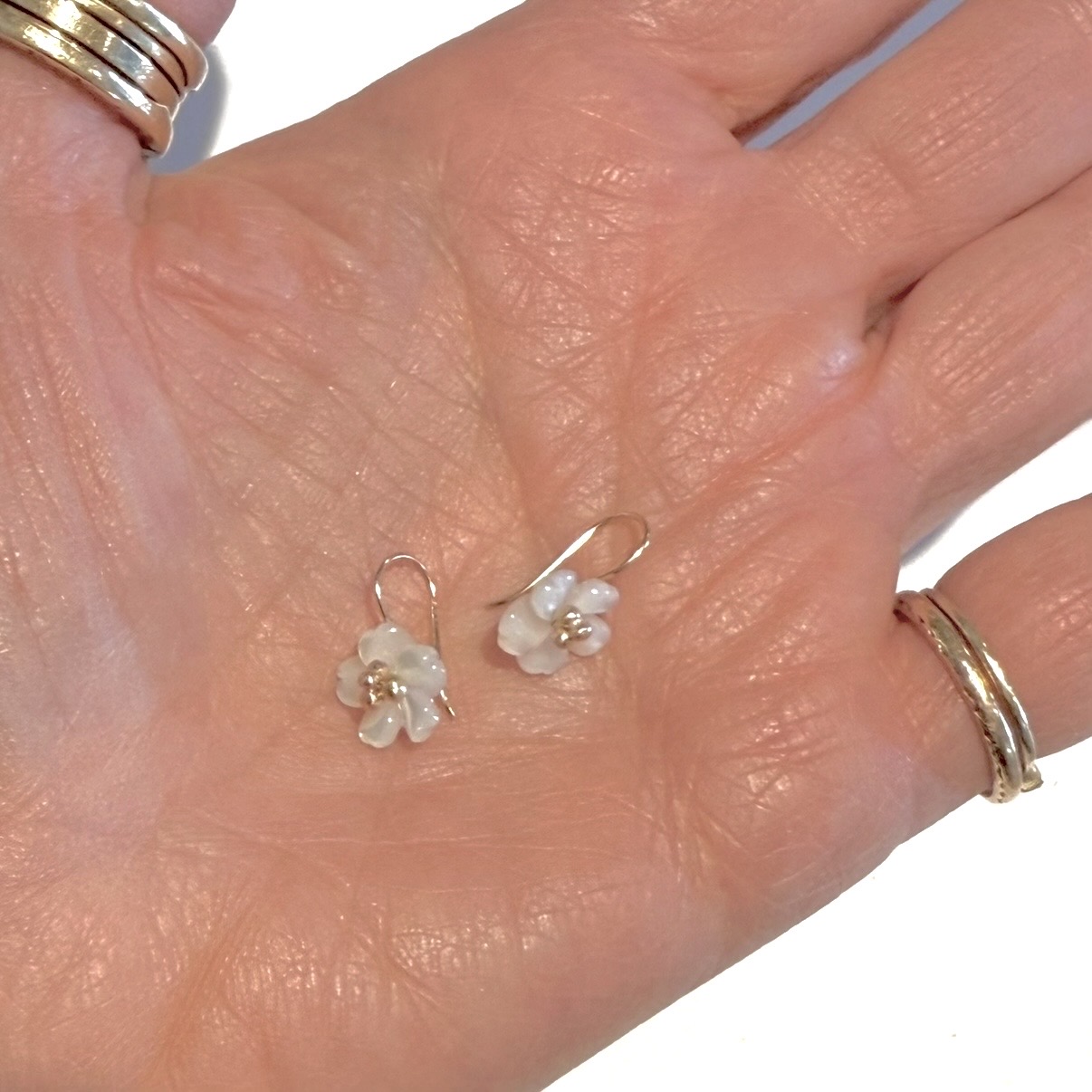 Carved Mother of Pearl hangs gracefully from a 14k yellow gold earwire. Diamond center, .5" drop length.