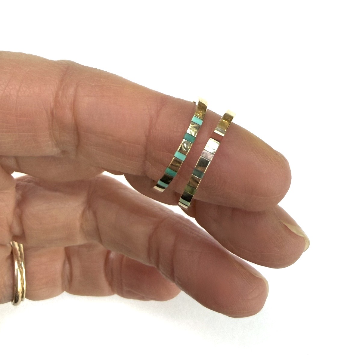 Artfully handcrafted fairmined 14k yellow gold ring with a mixed inlay of either: The Warm stack: Red Jasper, Rhodonite, Larsonite Jasper, and Lemon Chrysophrase size 7 - or The Cool stack: Colorado Turquoise ans Arizona Chrysocola size 7.25. 2mm width, price reflects 1 ring. Please specify color combo.