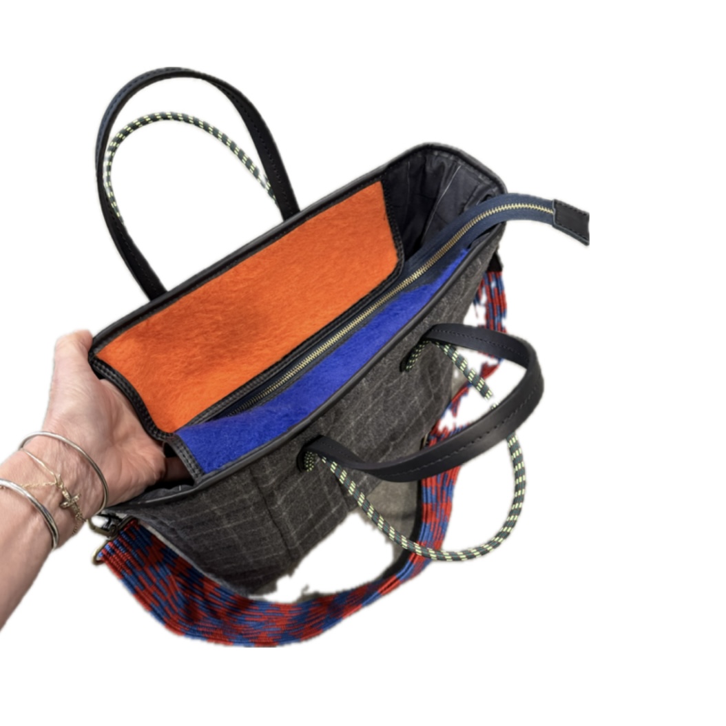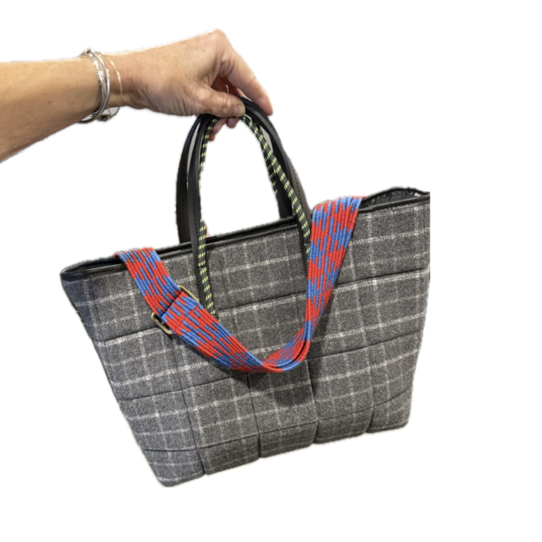 A WAY COOL quilted wool plaid tote bag with duo handhold strap (one black leather, one stretch patterned) and adjustable woven/patterned crossbody strap. Felt enforced zip closure flaps in blue and red/orange, zip inner pocket. 5 x 12" soft, flat bottom x 11" tall. Made in Italy.
