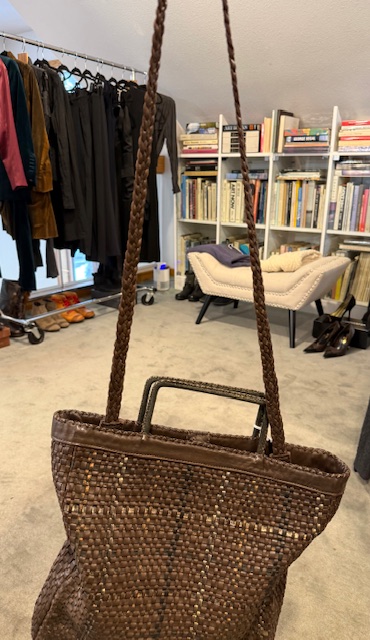 Woven chocolate brown leather bag with angular hand hold and long, crossbody strap. Hand made by En Shalla, Morocco. This pre-loved item is a final sale.