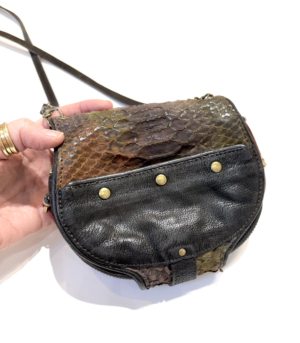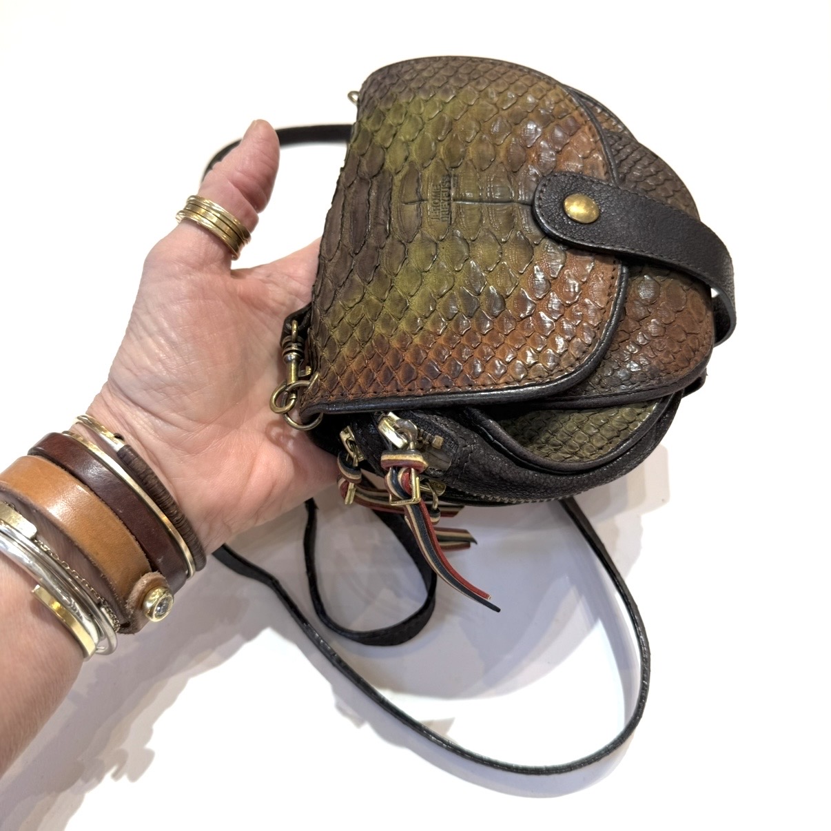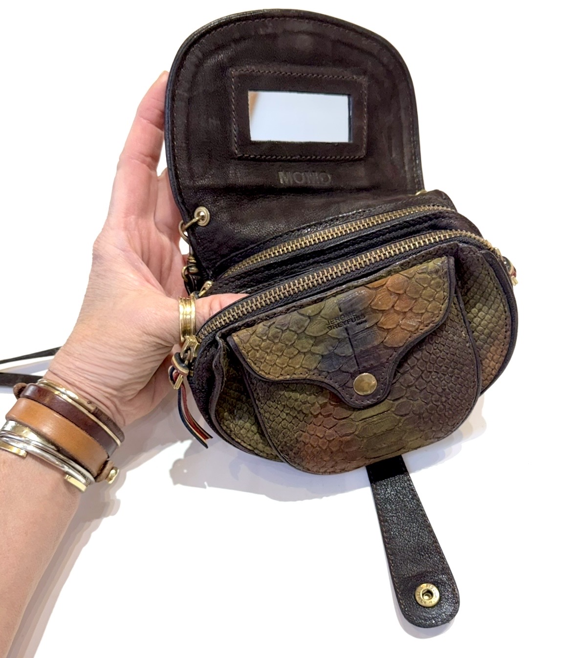 Jerome Dreyfuss ombre snake print and chocolate leather crossbody/shoulder bag. Flap closure with snap tab, double inner zip compartments and credit card compartments. Inner flap mirror and backside snap pocket. This pre-loved item is a final sale.