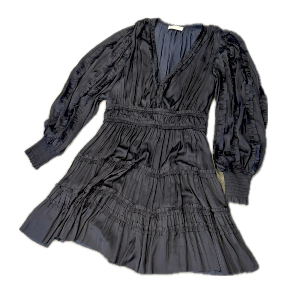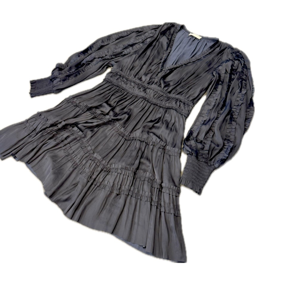 Black poly dress with puff slleves, gathered cuffs and ruffle trim. Dry clean. This pre-loved item is a final sale.