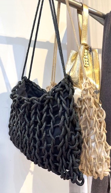 The Sara interwoven shoulder bag in black organic cotton with lurex detailing. Natural heavy cotton interior with internal slip pocket and drawstring closure. Double handle, 11" strap drop. Made in Italy.
