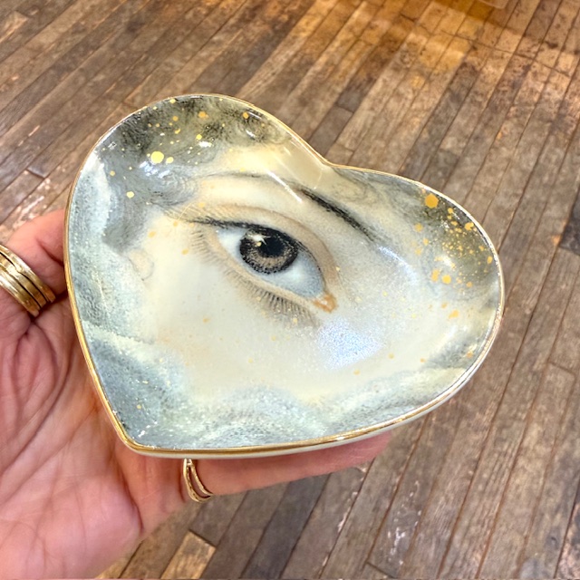 Heart-shaped ceramic trinket dish captures inspired by the sentimental keepsakes of the past. Measures 5" wide.