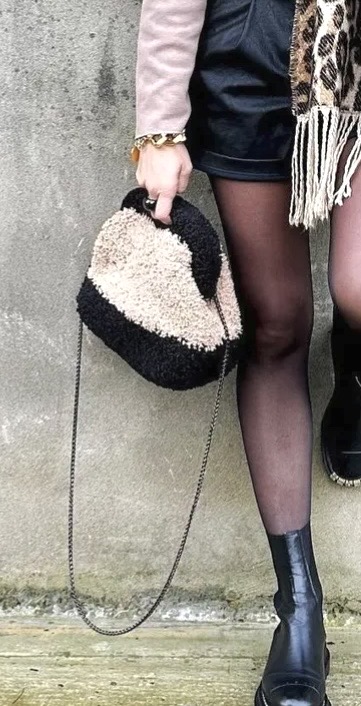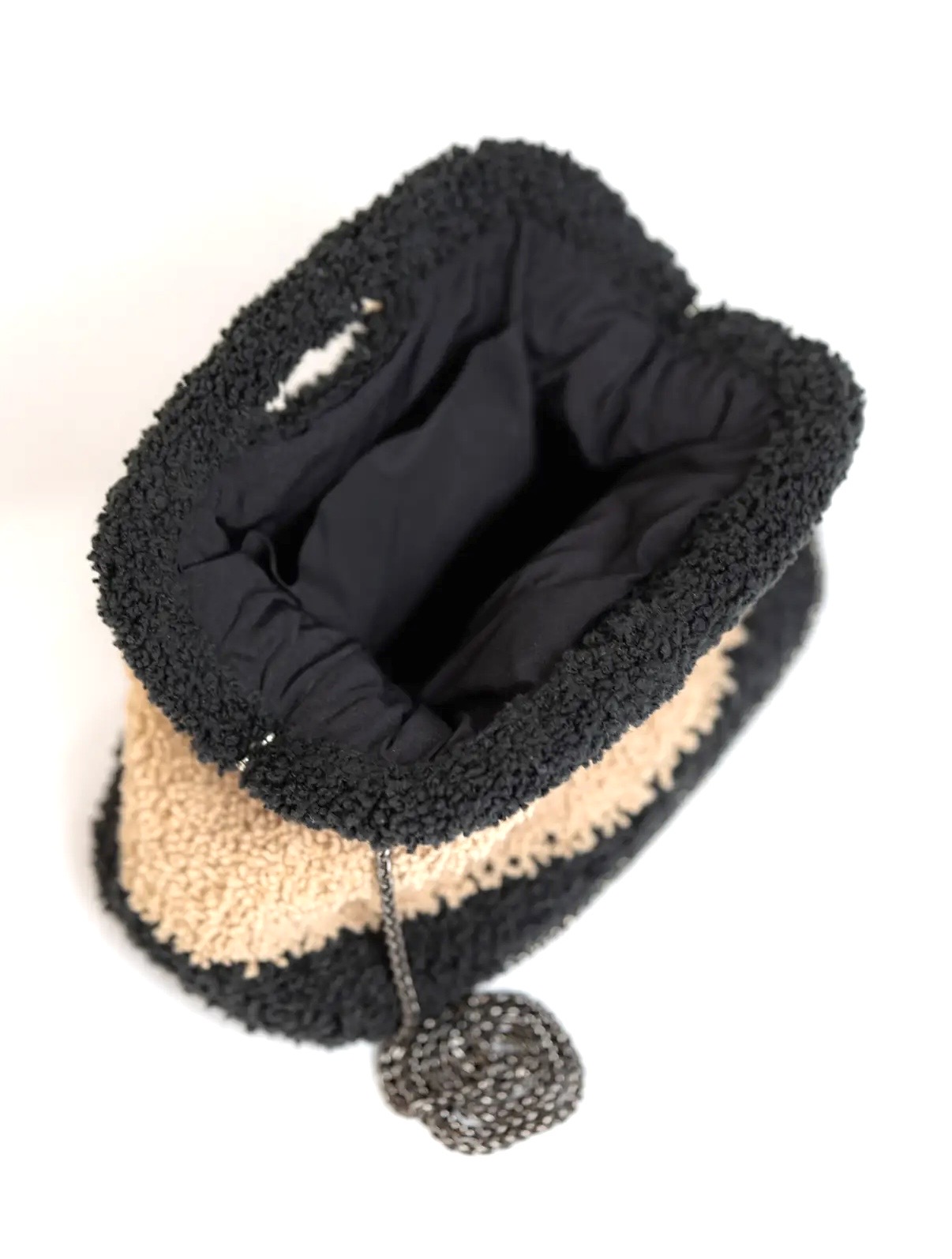 A hand crochet quality, fluffy yarn bag with a metal bourse mechanism closure and inner lining with pocket. Chain shoulder stap option included.