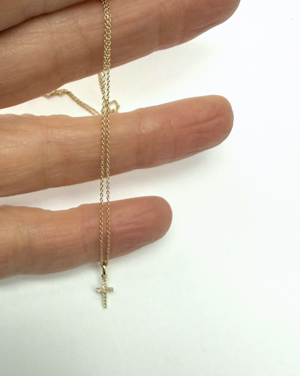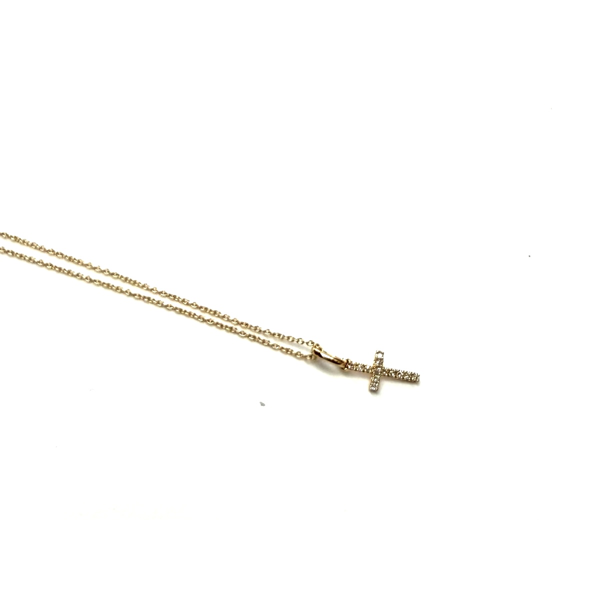 18k yellow gold cross pendant with 13 pave set white diamonds, 1/2" drop length including bale. 14k gold chain with length stations at 16, 17 and 18".