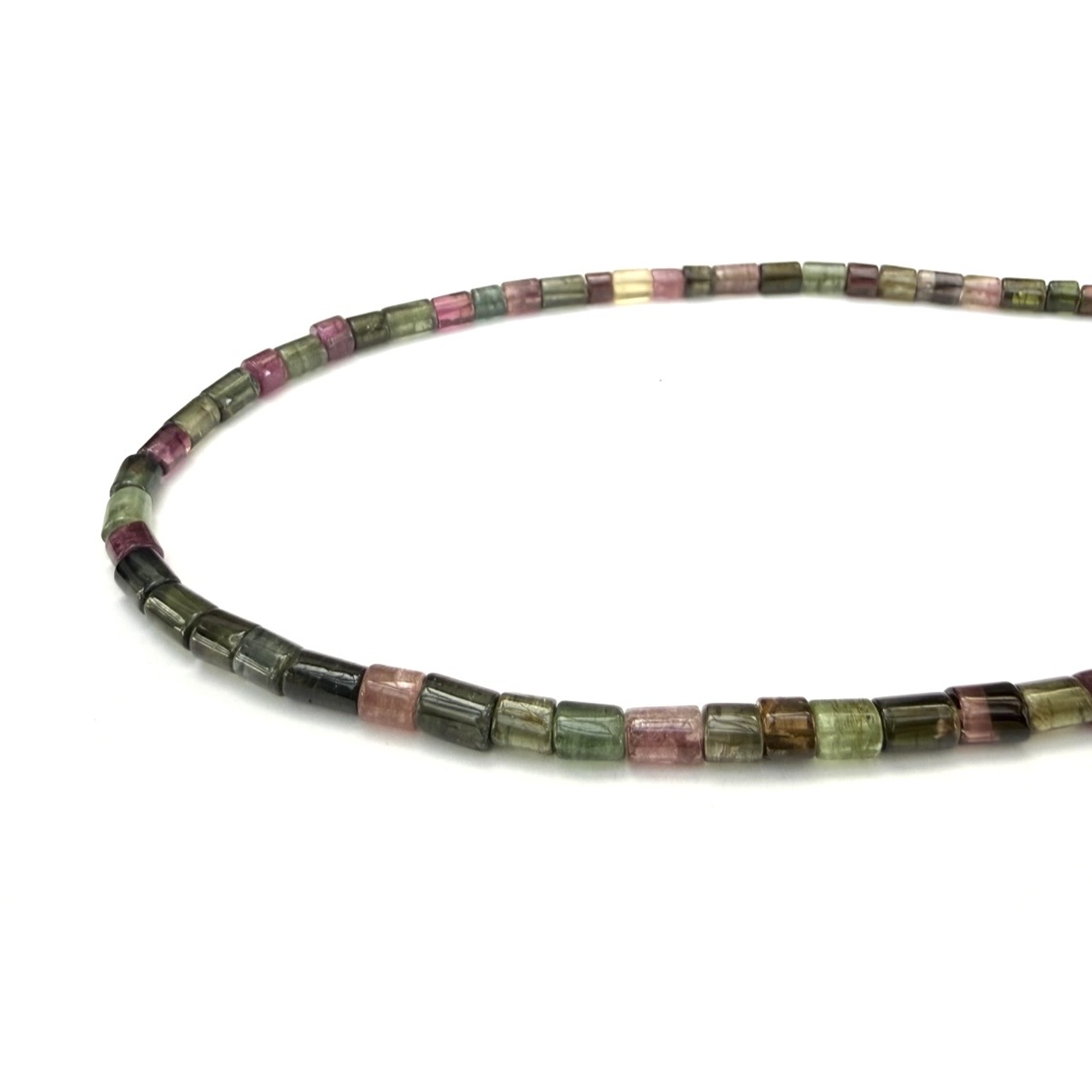 A beautiful string of multi-colored tourmaline tube beads, sterling silver clasp and chain extension.
