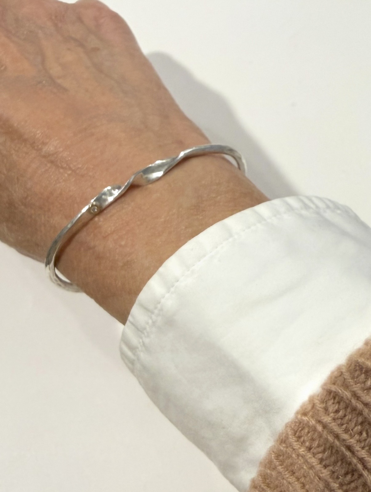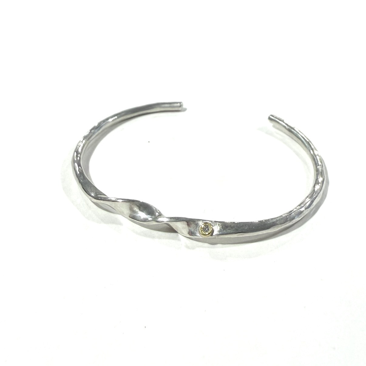 Sterling siver cuff bracelet with top twist and 22k yellow gold, bezel set white diamond. The perfect everday wrist swag!