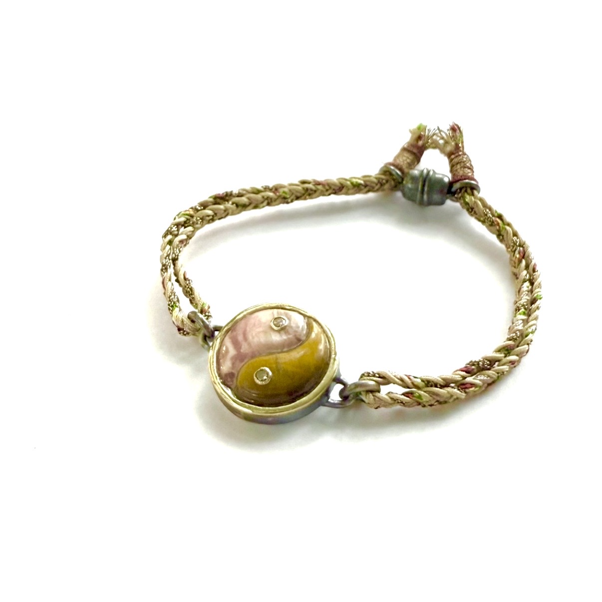 Tiger eye and rhodochrosite yin and yang bracelet with duo white diamond accents. All gemstones are bezel-set in 10k yellow gold. Ancient craft techniques using woven fiber create a uniquely beautiful detail. Sterling silver backing. Adjustable length, easy use silver/magnet clasp.