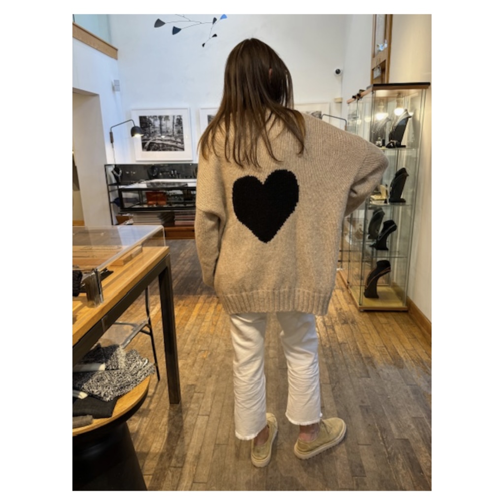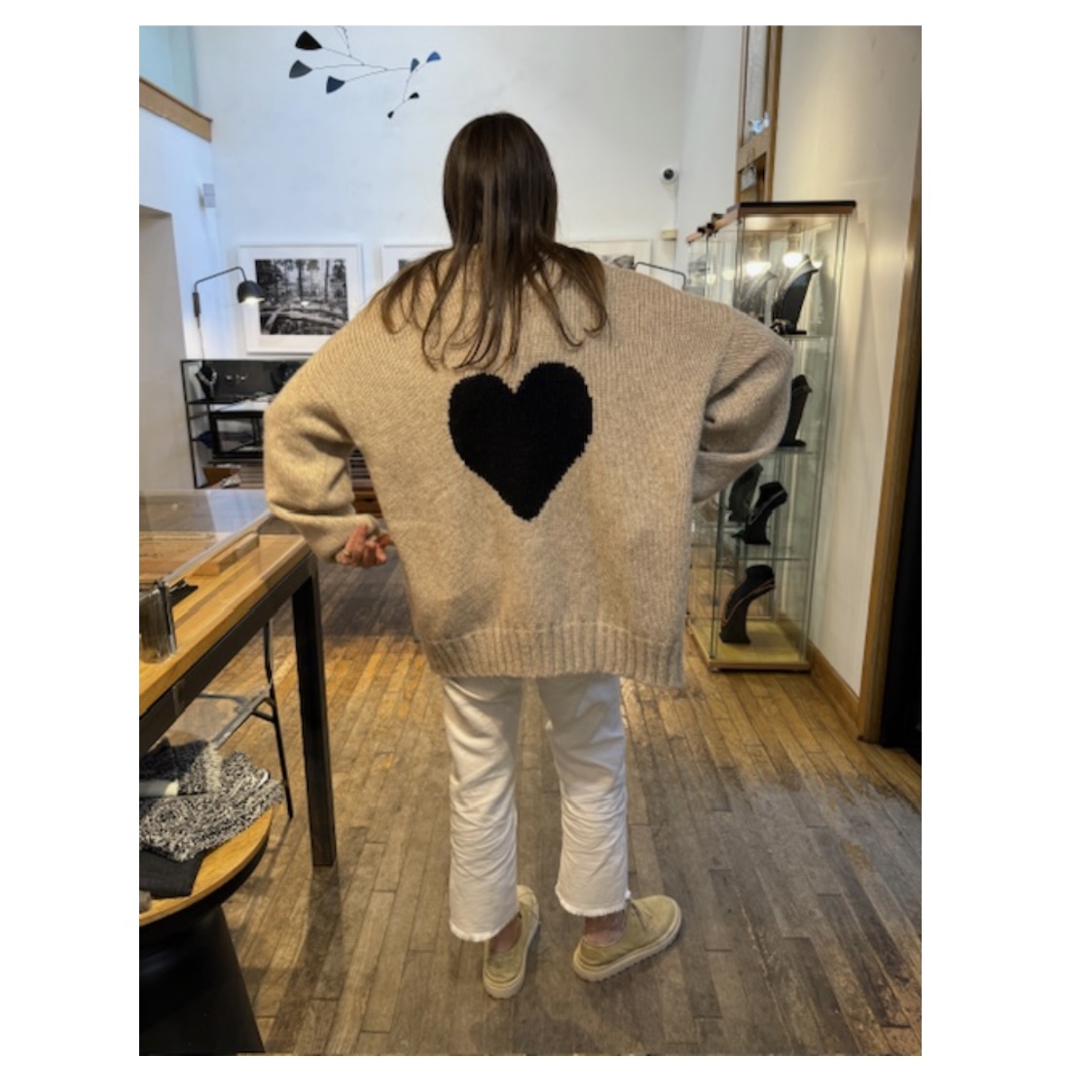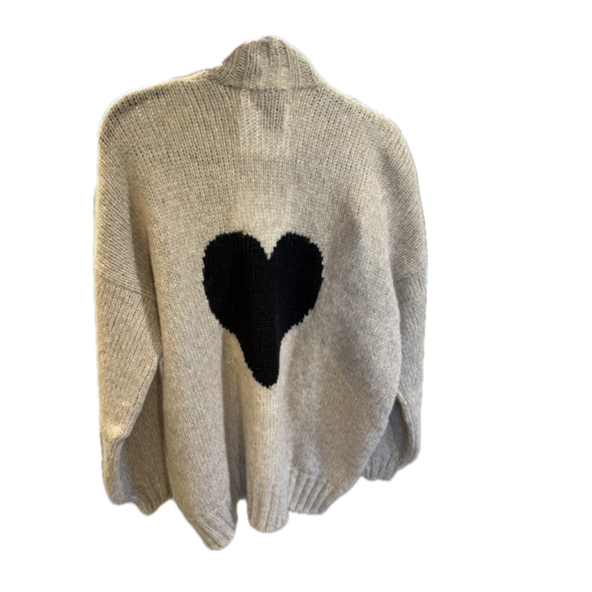 The perfect combination of style and comfort, this fun baby llama-wool blend cardigan will become your season's favorite cardigan... and the heart on your back let everyone know it! Easy to style up or down it will keep you fashionably warm. Lightweight, thick knit, pockets, no buttons. 75% baby llama wool / 25% recycled materials. Hand wash cold or dry clean. Available in small, medium and large - please specify.